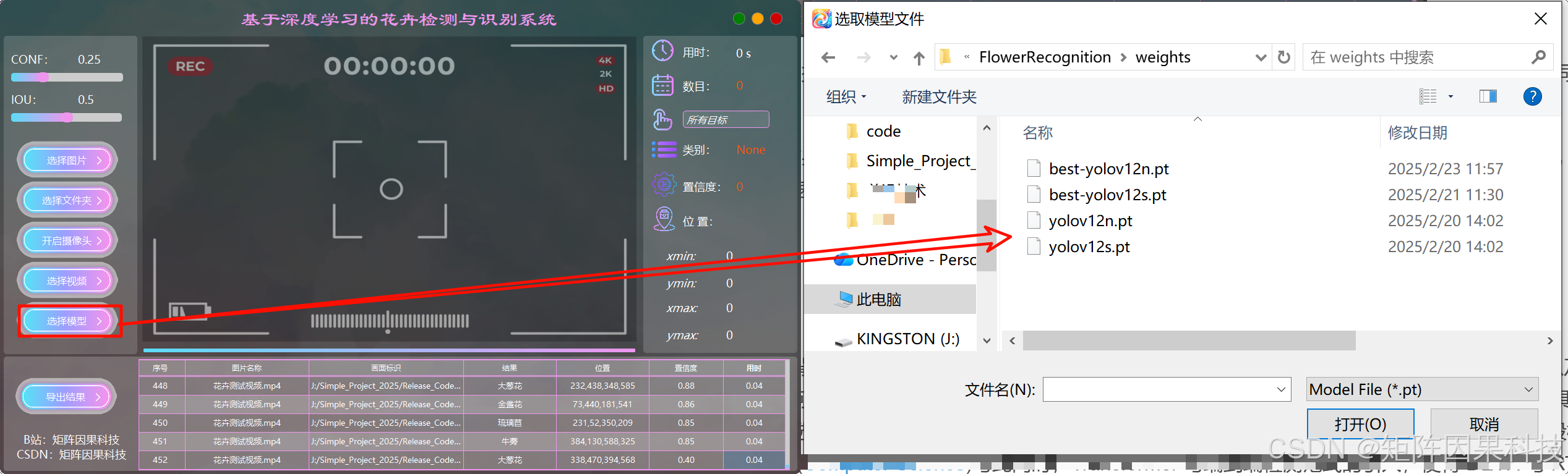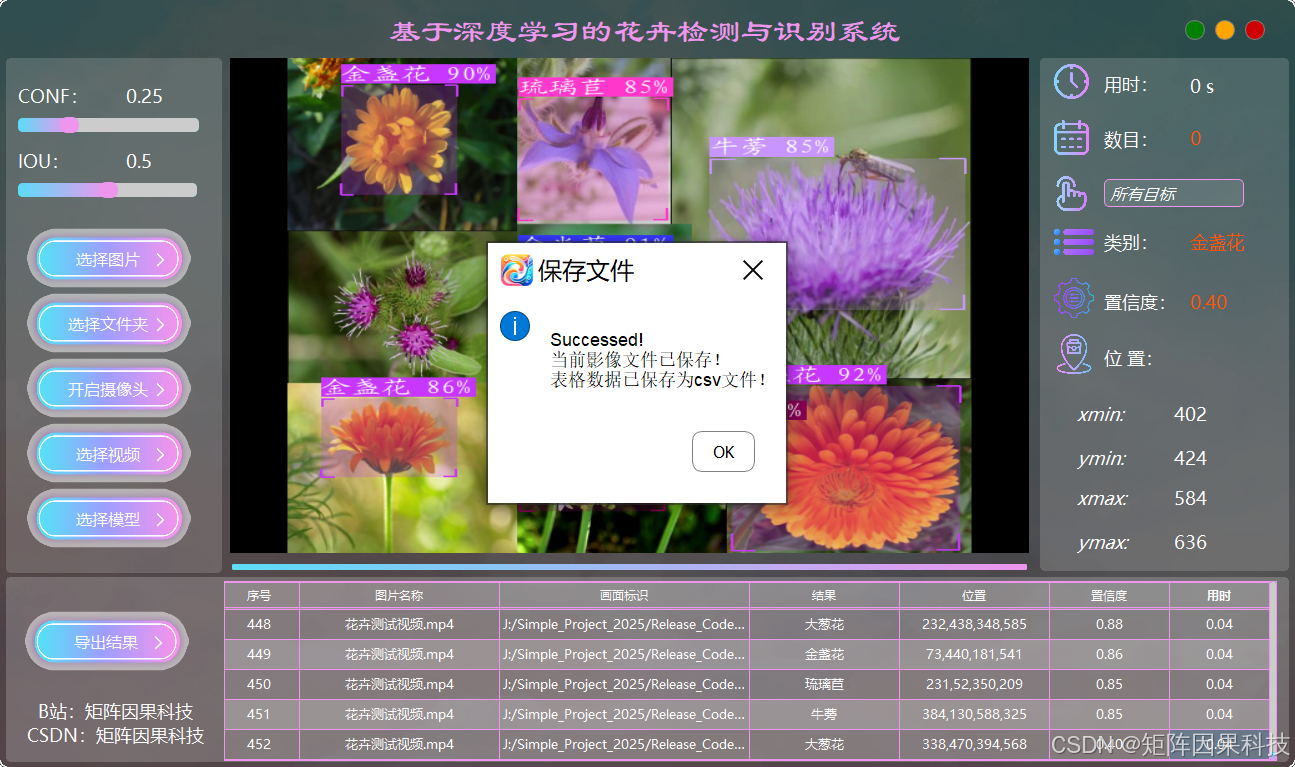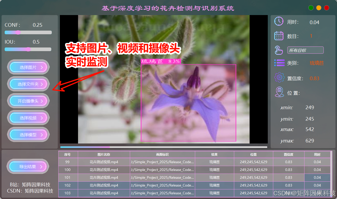 (2) 在图片、视频和摄像头三种模式下,界面会实时叠加花卉检测框、类别名称和置信度,并通过进度条和帧计数提示当前处理进度和推理用时。