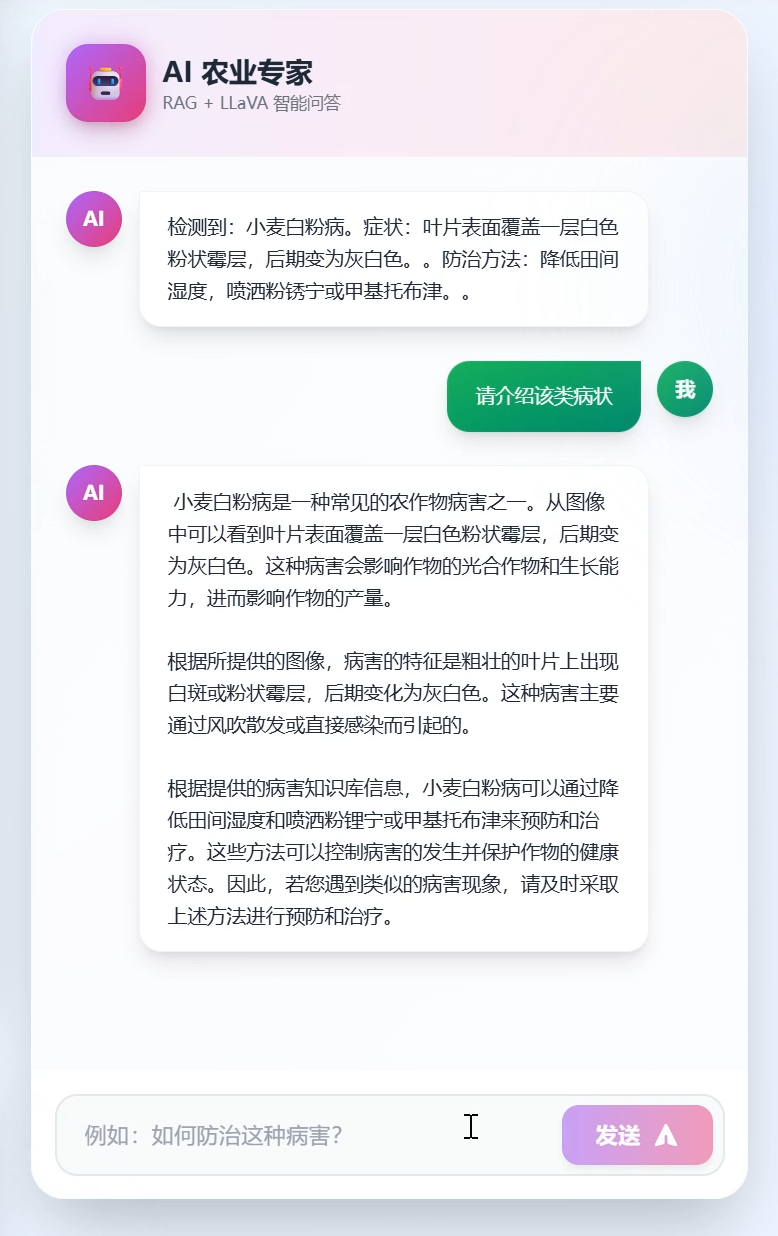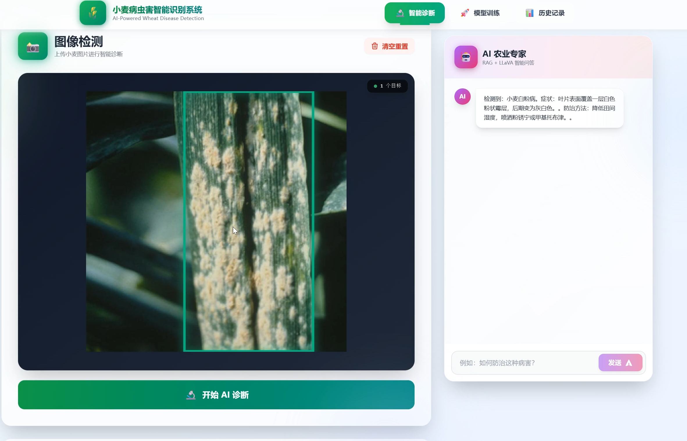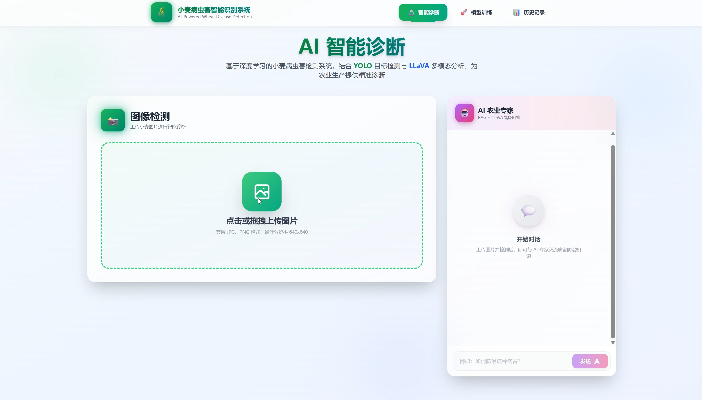 小麦病虫害智能识别系统是一个结合了 YOLO 目标检测和 LLaVA 多模态 AI 的农业科技应用,旨在为农业生产提供精准、快速的病虫害诊断服务。
