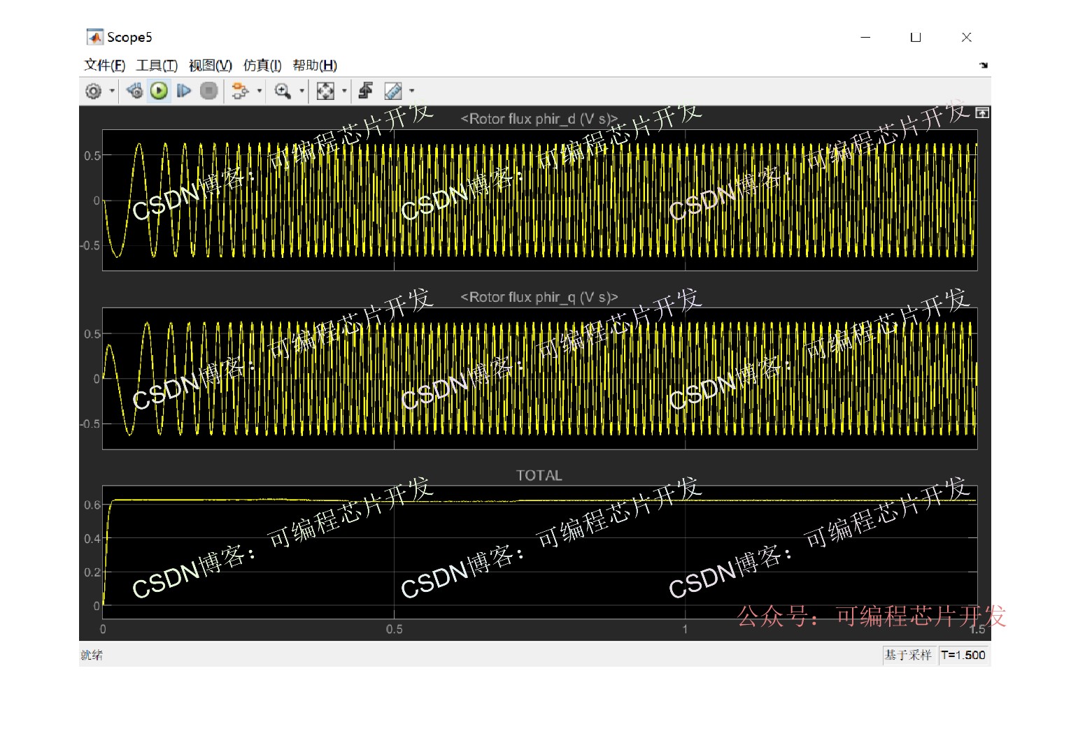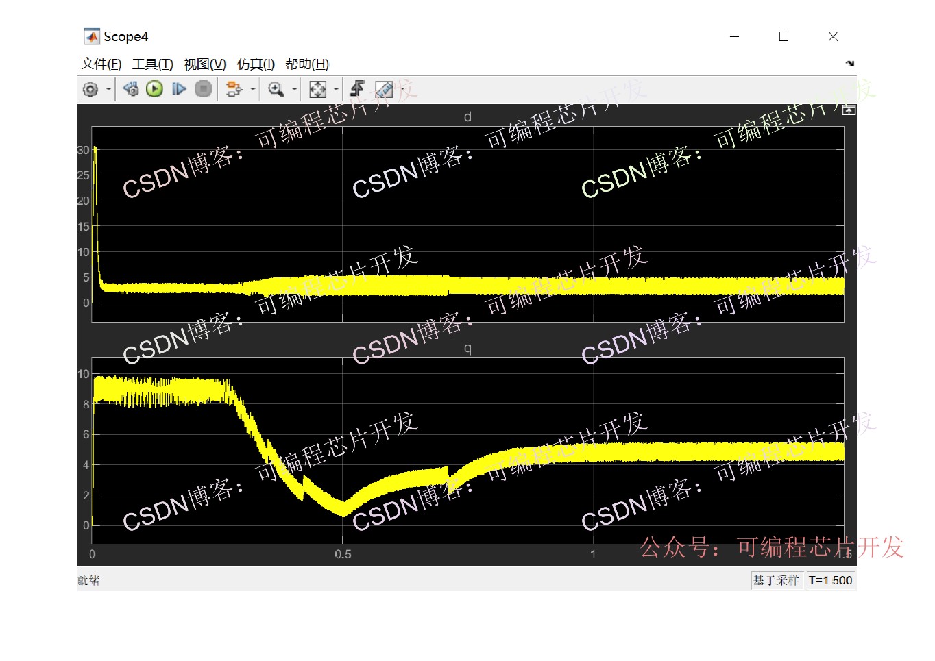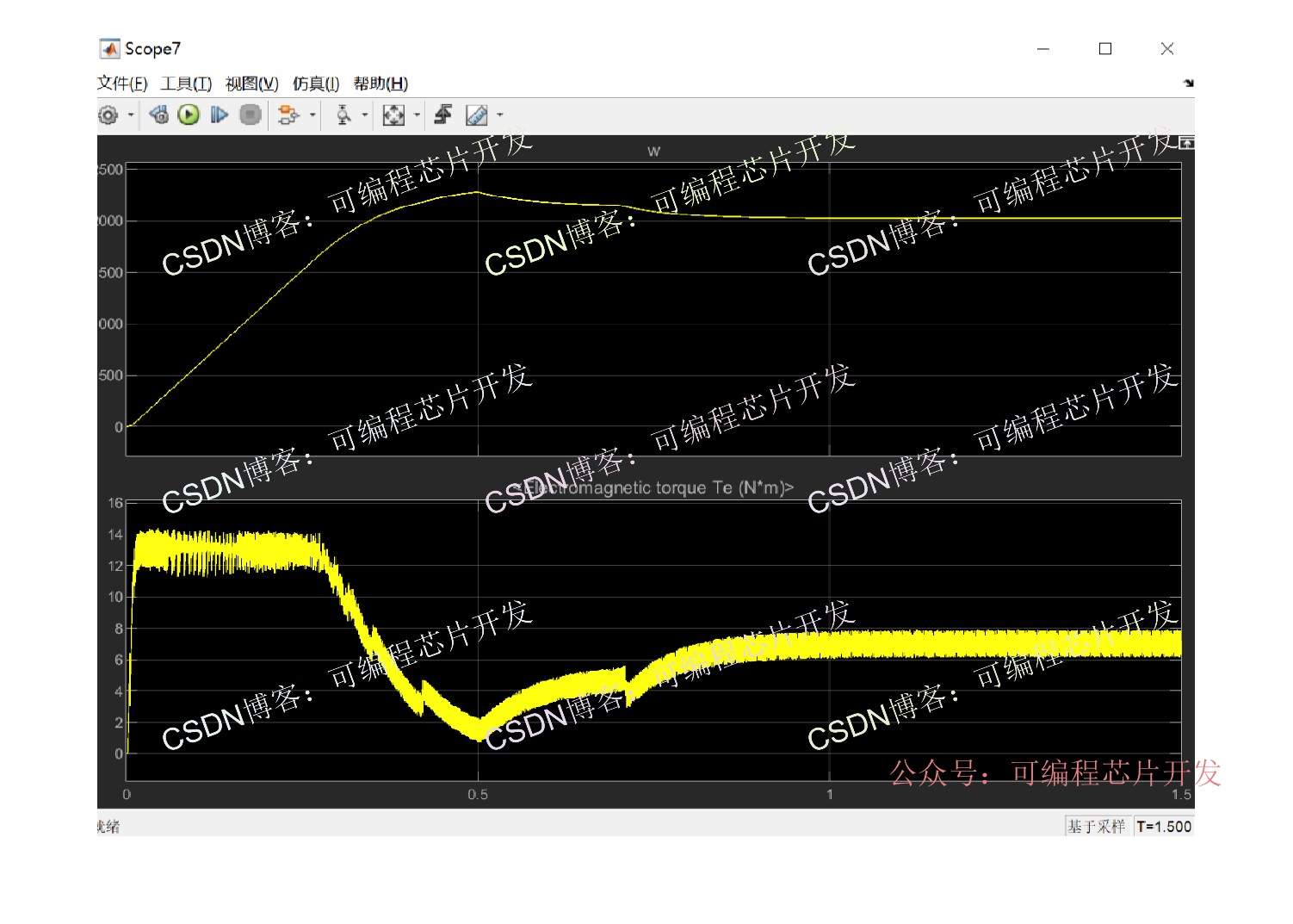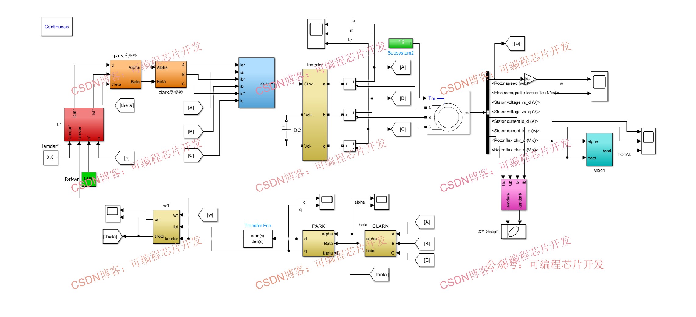 磁场定向控制(FOC)是通过坐标变换(Clark、Park)将三相定子电流转换为同步旋转坐标系下的励磁电流(id)和转矩电流(iq),实现二者的解耦控制,从而像直流电机一样独立调节磁场和转矩。在这个课题中,我们将使用simulink完成上述功能。