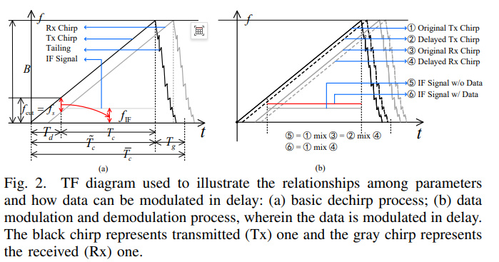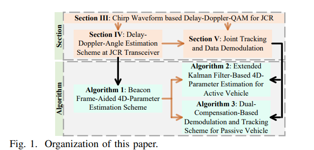 为此,本文致力于在不损害毫米波雷达基础感知能力的前提下,赋予其通信功能,实现通信与雷达功能的无缝融合,主要贡献包括三点:一是采用“先听后说”机制,选择空闲时频资源,通过DD-QAM在单帧啁啾信号上调制延迟、多普勒和振幅数据,同时支持环境感知;二是利用跟踪过程中的相对运动,提出基于扩展卡尔曼滤波器(EKF)的五维(5D)参数估计方案,相比传统四维感知新增切向速度估计,并通过频谱泄漏实现准离格估计;三是基于跟踪过程的时间序列信息,提出双补偿解调与跟踪方案,在解调数据的同时去除调制信息以保障感知功能。