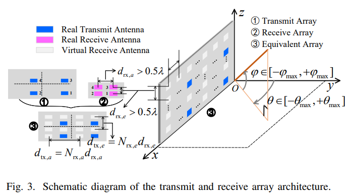 自动驾驶车辆分为主动车辆(AV)和被动车辆(PV),二者配备相同的JCR收发器,可根据需求切换角色。AV负责发送调制数据的JCR信号并接收回波进行环境感知,PV负责接收信号并解调数据、感知环境。帧结构采用信标帧辅助的多普勒分复用(DDM)模式:信标帧仅激活第一个发射天线,确保每个目标在距离-多普勒图(RDM)上对应唯一检测区域,实现距离和速度的无模糊估计;DDM帧激活所有发射天线,每个目标对应多个检测区域,用于区分发射天线并估计方位角和仰角。