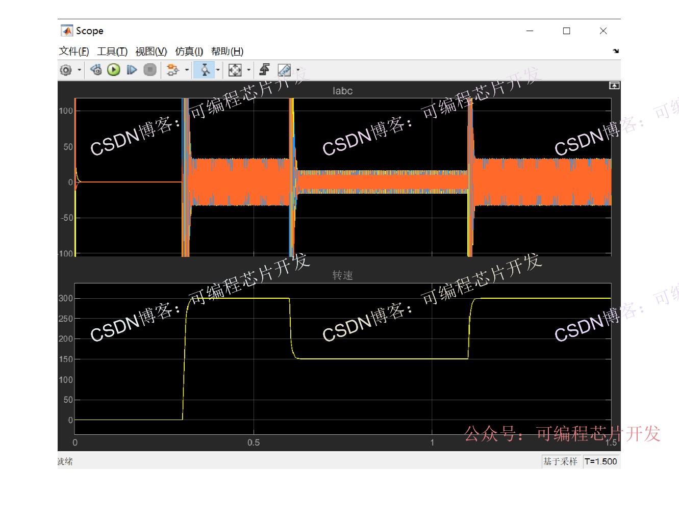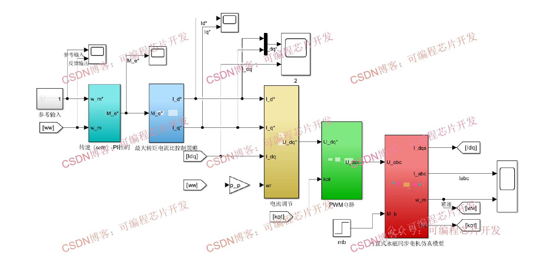 本系统为速度、电流双闭环矢量控制系统,核心目标是在给定转速下,通过最大转矩电流比(MTPA)控制,使电机在相同输出转矩下定子电流最小,从而提升效率、降低铜耗。系统通过坐标变换将三相交流量转换为旋转dq坐标系下的直流量,实现解耦控制,再结合MTPA算法生成最优电流指令,最终通过PWM驱动电机运行。