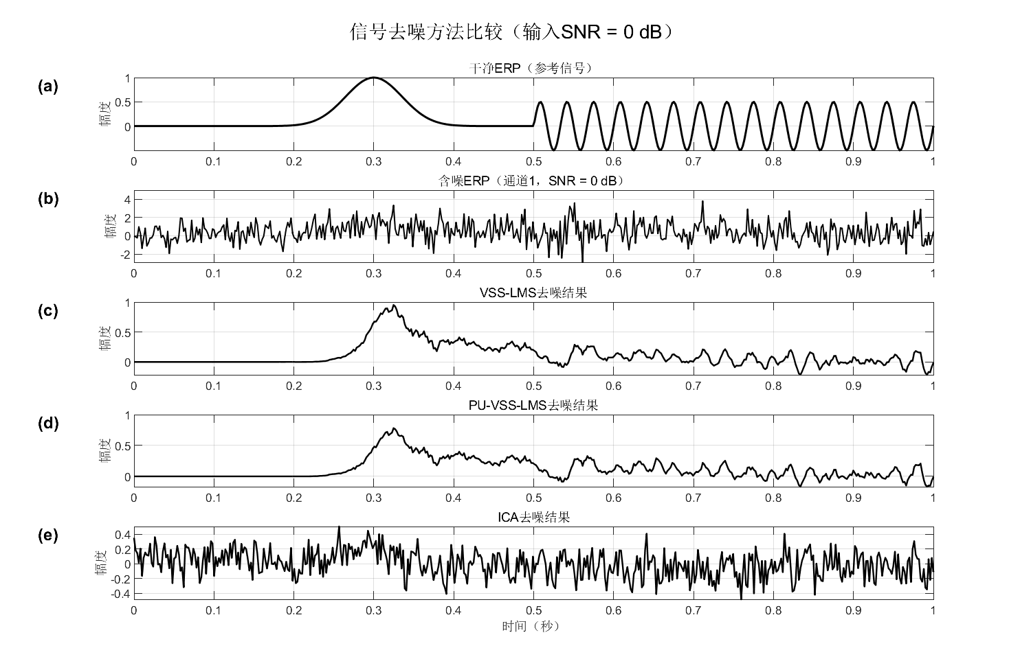 信号生成:合成包含高斯峰与高频振荡的ERP模板,加入多类型噪声生成多通道含噪信号