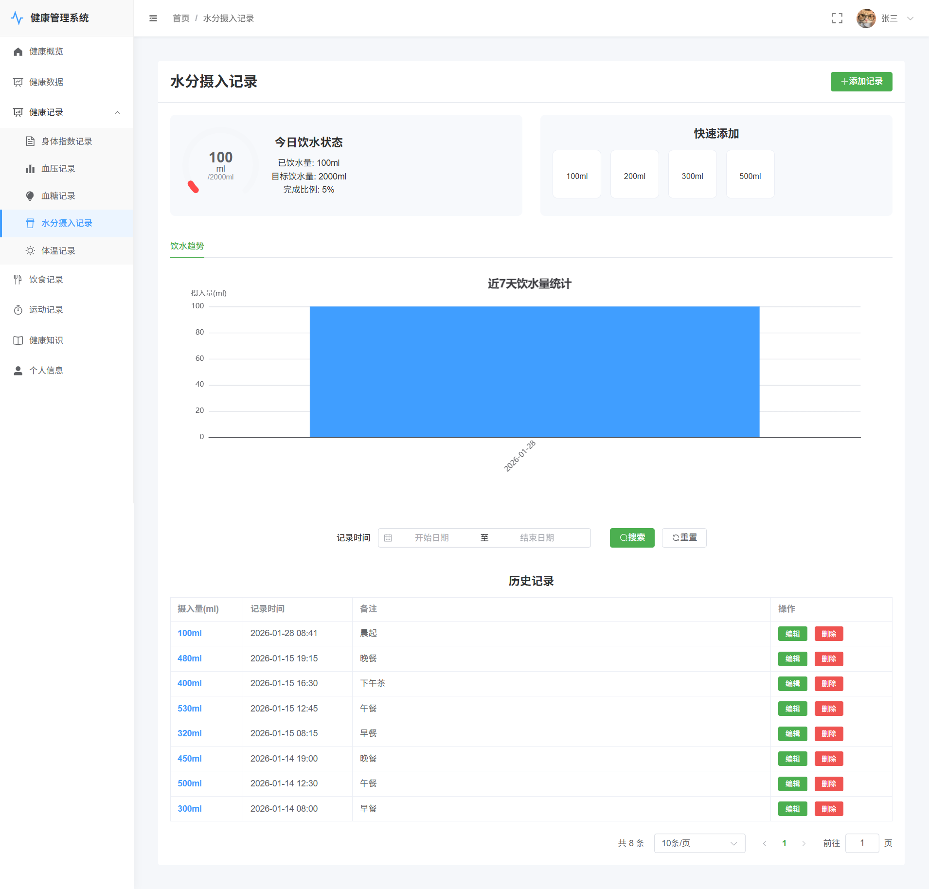 用户->水分摄入记录