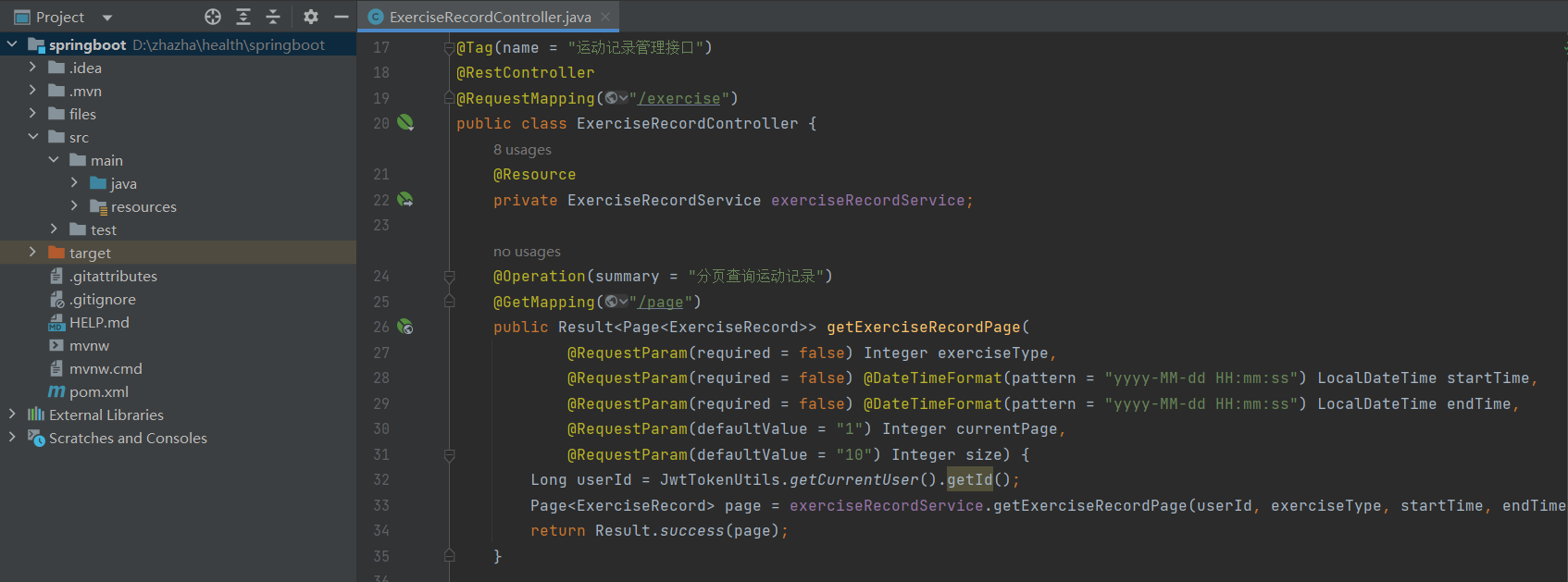 Page page = exerciseRecordService.getExerciseRecordPage(userId, exerciseType, startTime,
