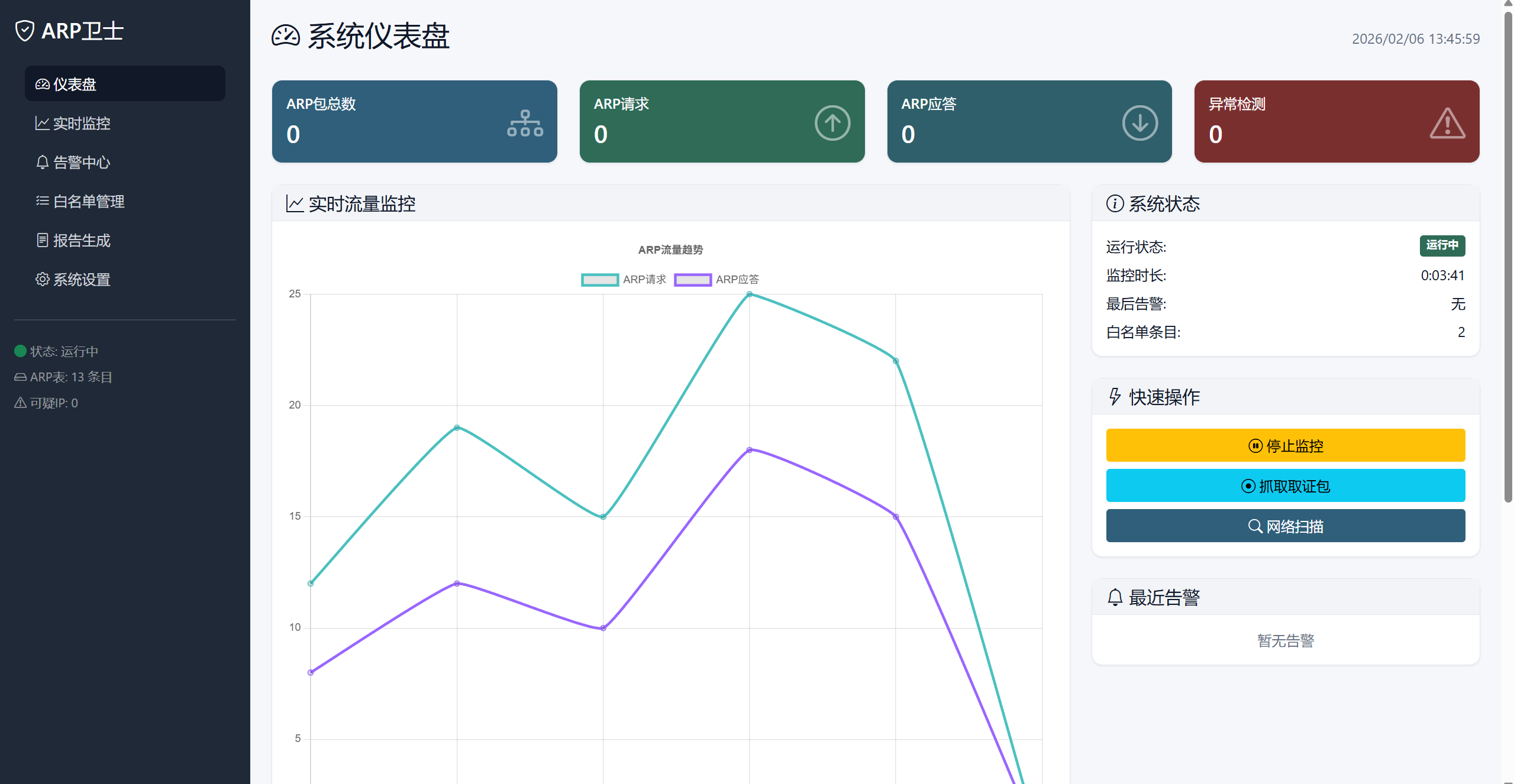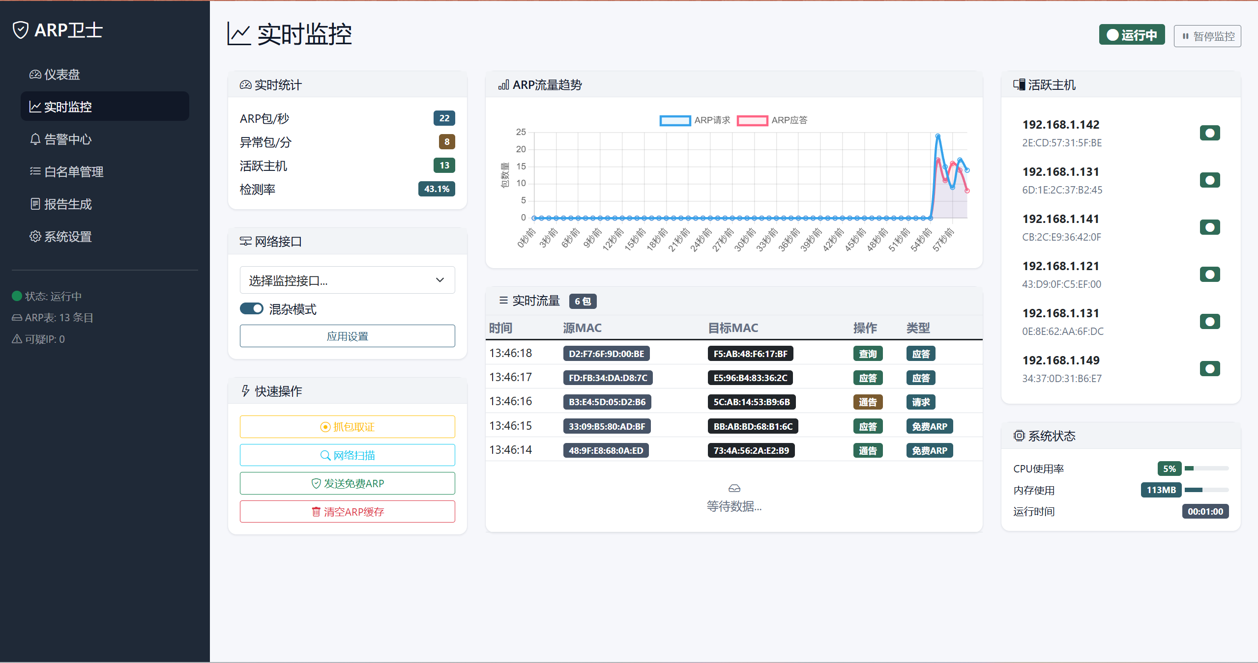 - 实时ARP流量监控:持续监控网络中的ARP请求和响应