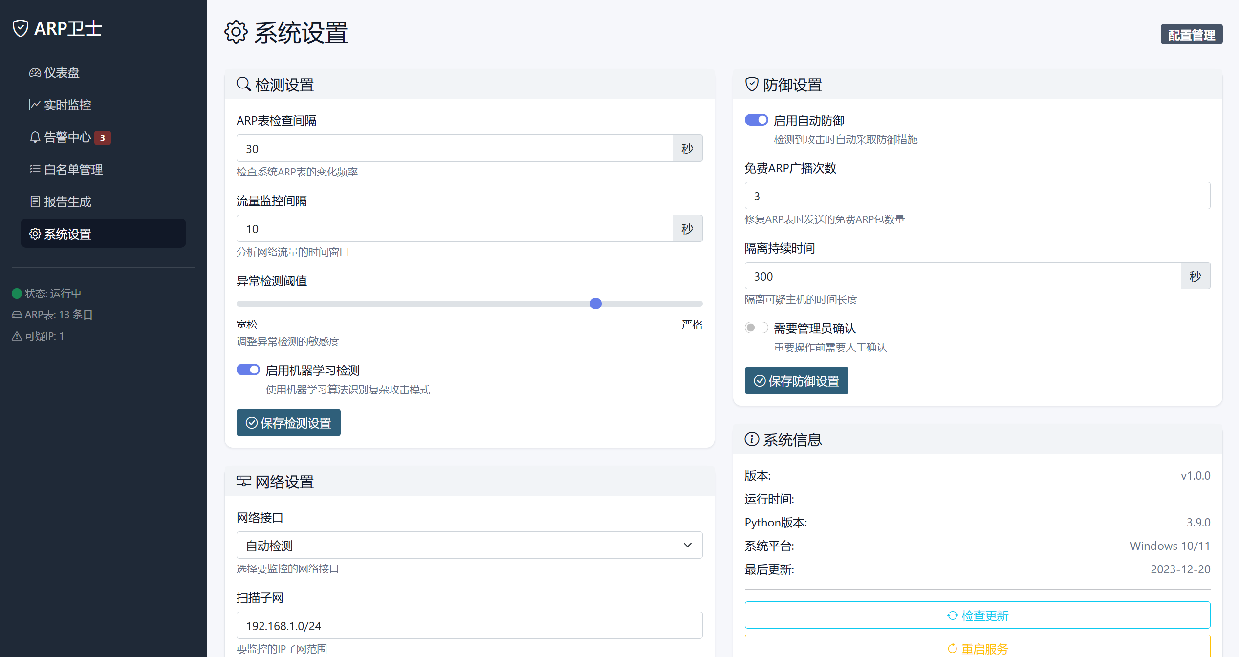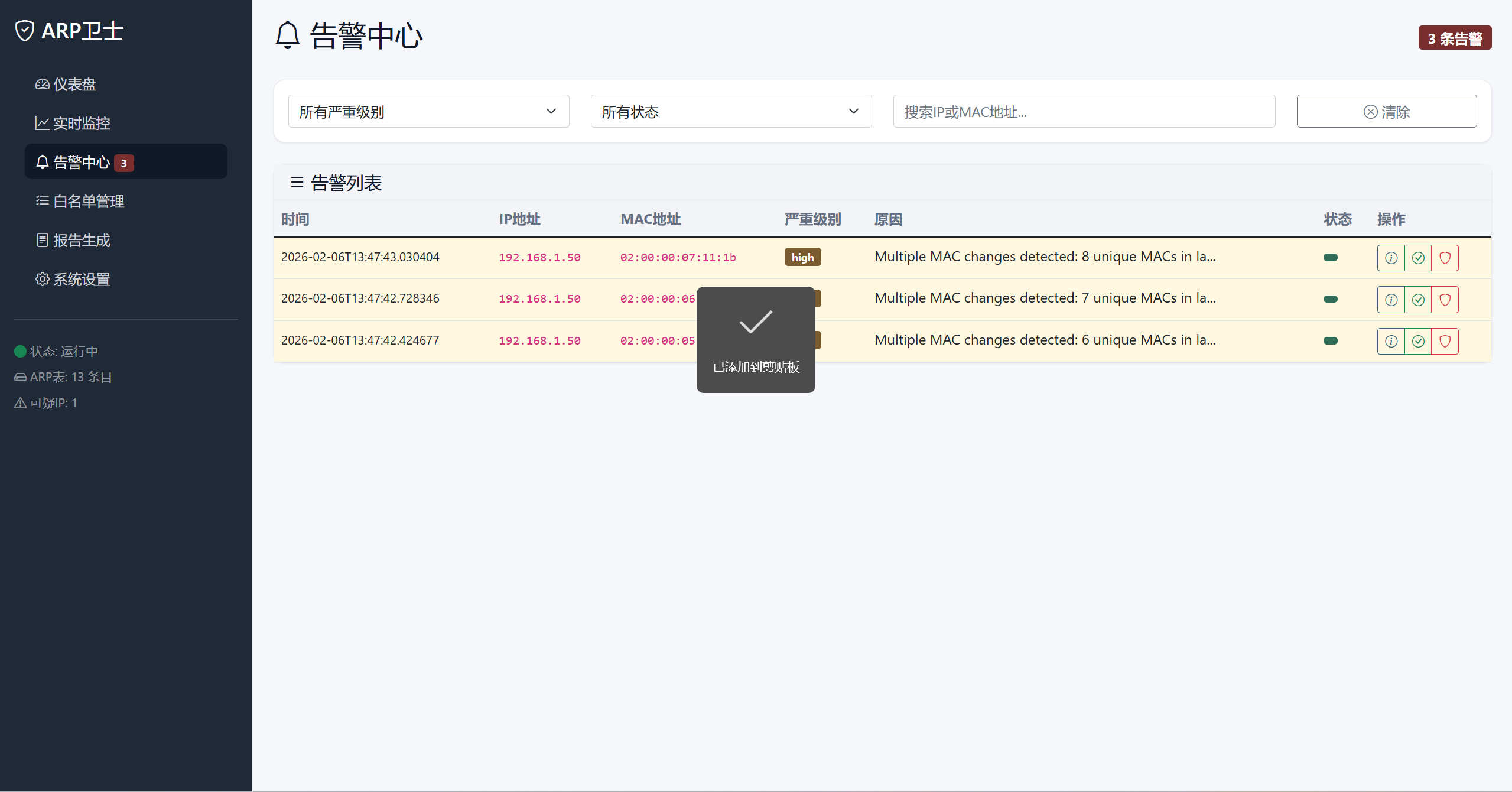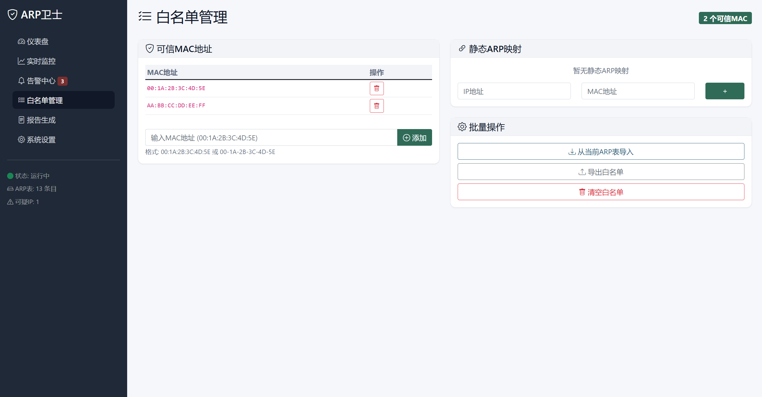 - 白名单管理:支持可信MAC地址和静态ARP映射