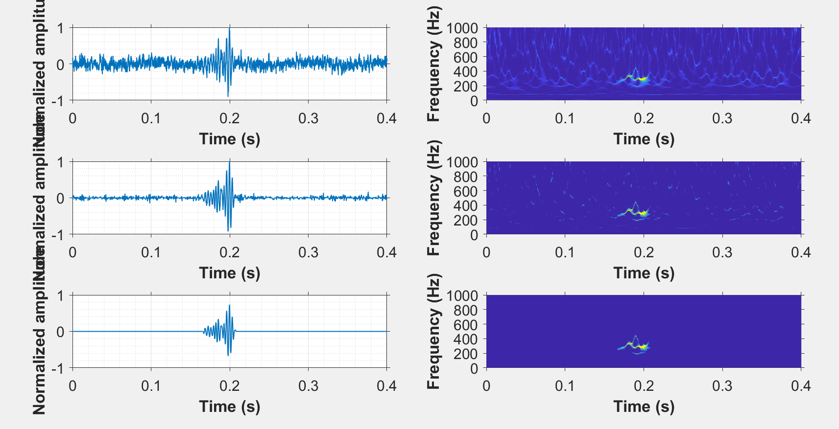 对含噪数据执行同步压缩小波变换,获得高分辨率的时频系数矩阵 dn.org_tf 和频率向量 dn.org_f,同时保留原始信号的时域波形。