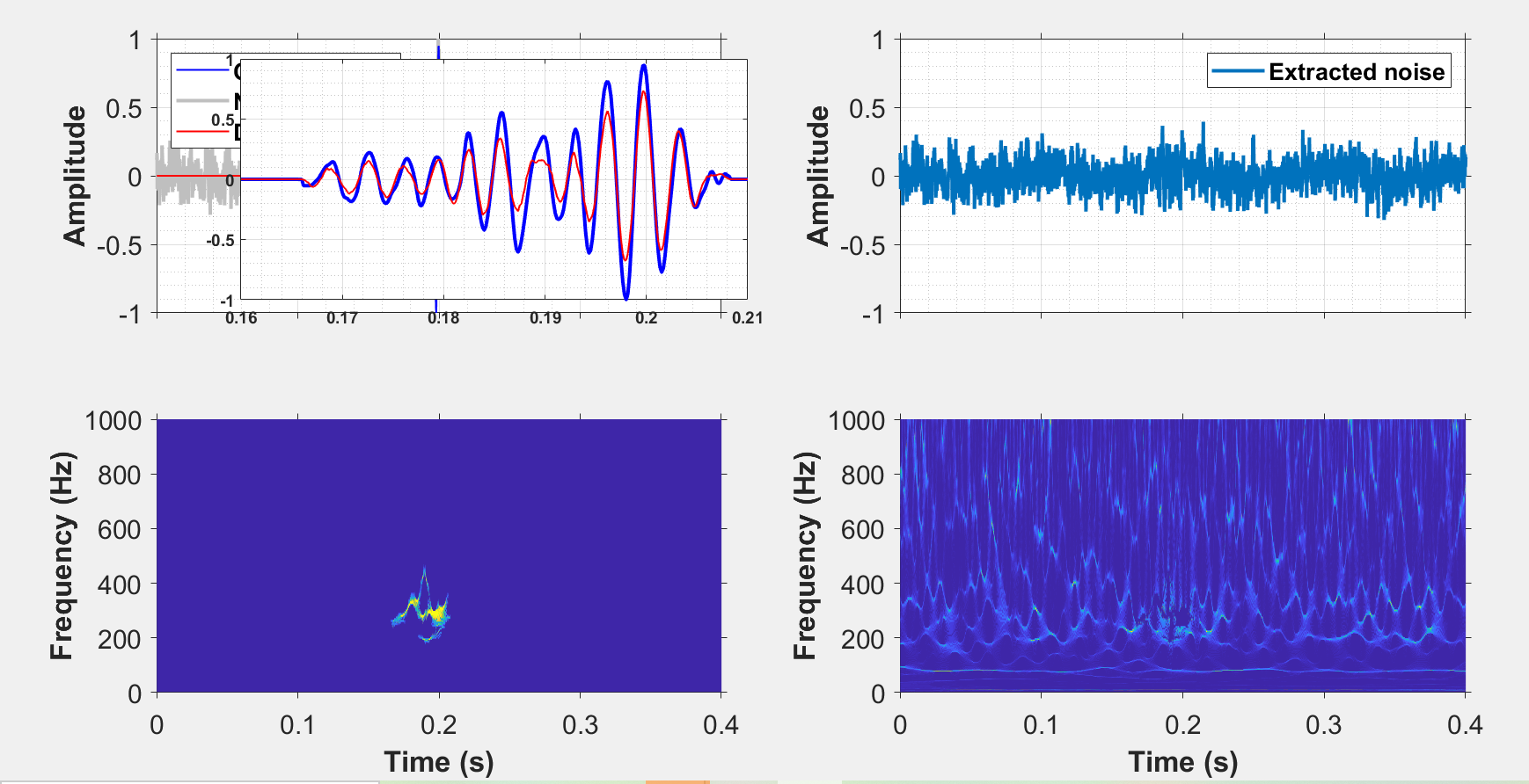 算法提出了一种结合同步压缩小波变换、广义交叉验证自适应阈值与形态学连通性分析的地震数据去噪方法。首先,通过高分辨率时频变换将含噪信号映射到时频域,并利用 GCV 准则自动估计各时频点的最优加权系数,实现初步噪声压制;随后,基于像素连通性(4邻域或8邻域)对加权时频系数进行形态学处理,识别并保留有效信号的连续能量团,同时剔除孤立噪声分量,从而在时频域中生成优化的掩膜;最后,通过逆变换重构时域波形,获得最终去噪结果。该方法无需人工设定阈值,能自适应地适应不同噪声水平与信号特征,在有效压制随机噪声的同时,最大限度保留信号的细节和时频结构。通过与硬阈值、软阈值及带通滤波等传统方法的对比,本算法在波形保真度、时频谱清晰度和定量指标(SNR、RMS、相关系数)上均表现出显著优势,尤其适用于复杂非平稳地震记录的处理。