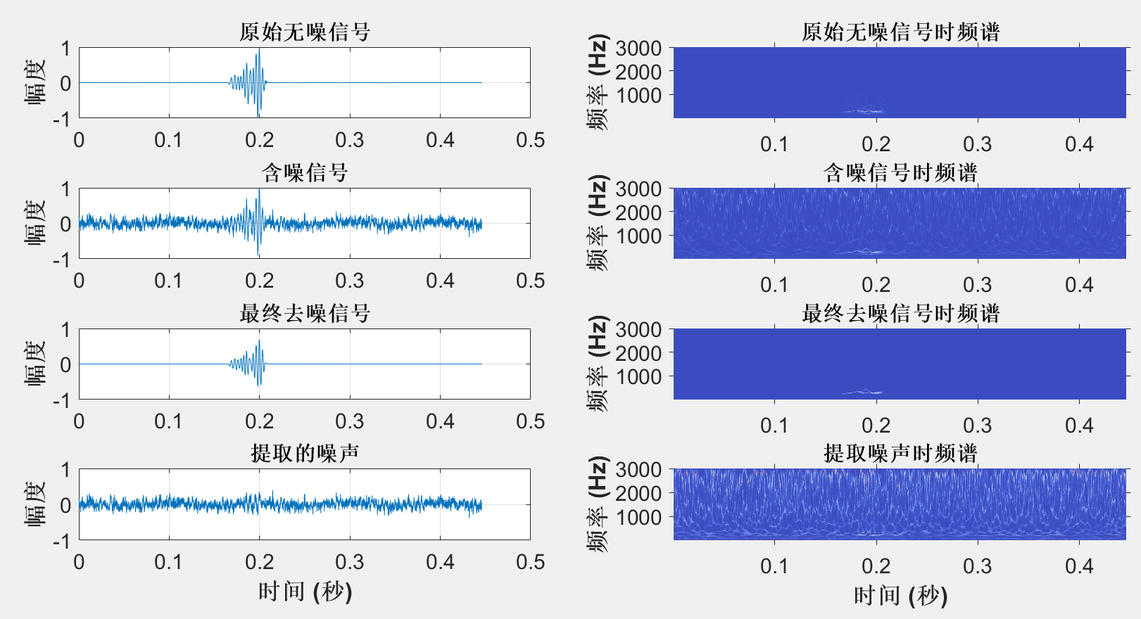 将原始时频系数与步骤4得到的频率相关阈值逐点比较,执行硬阈值操作:保留大于阈值的系数,将小于阈值的系数置零。这一步能有效压制大部分背景噪声,得到初步去噪的时频系数 dn.ecdf_tf,并通过逆变换重构初步波形 dn.ecdf_dw。