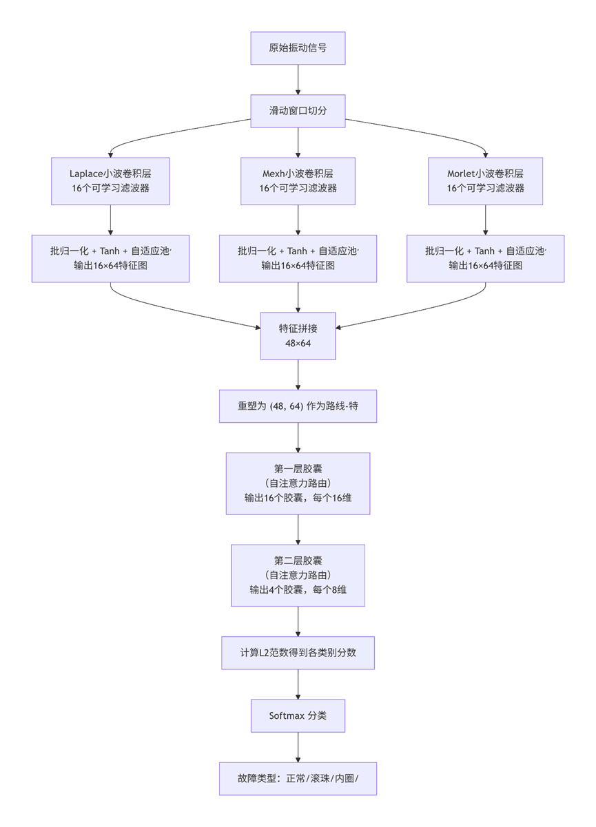 这个算法其实就是先用3个能自己调整参数的小波滤波器从振动信号里扒出不同频率的特征,然后把特征拼在一起送进一个叫胶囊网络的东西里。胶囊网络不像普通神经网络那样只给个数字,而是给出一串向量,能更好地描述特征之间的关系,最后根据向量长度判断是哪种故障。整个过程端到端自动完成,不用手动做时频图,小波参数还能根据数据自己优化,所以对不同的故障模式适应性强。