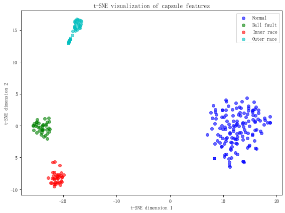 胶囊网络第二层:将16个胶囊向量作为输入,再次通过自注意力路由,生成4个胶囊向量(对应4种故障类型),每个向量8维。
