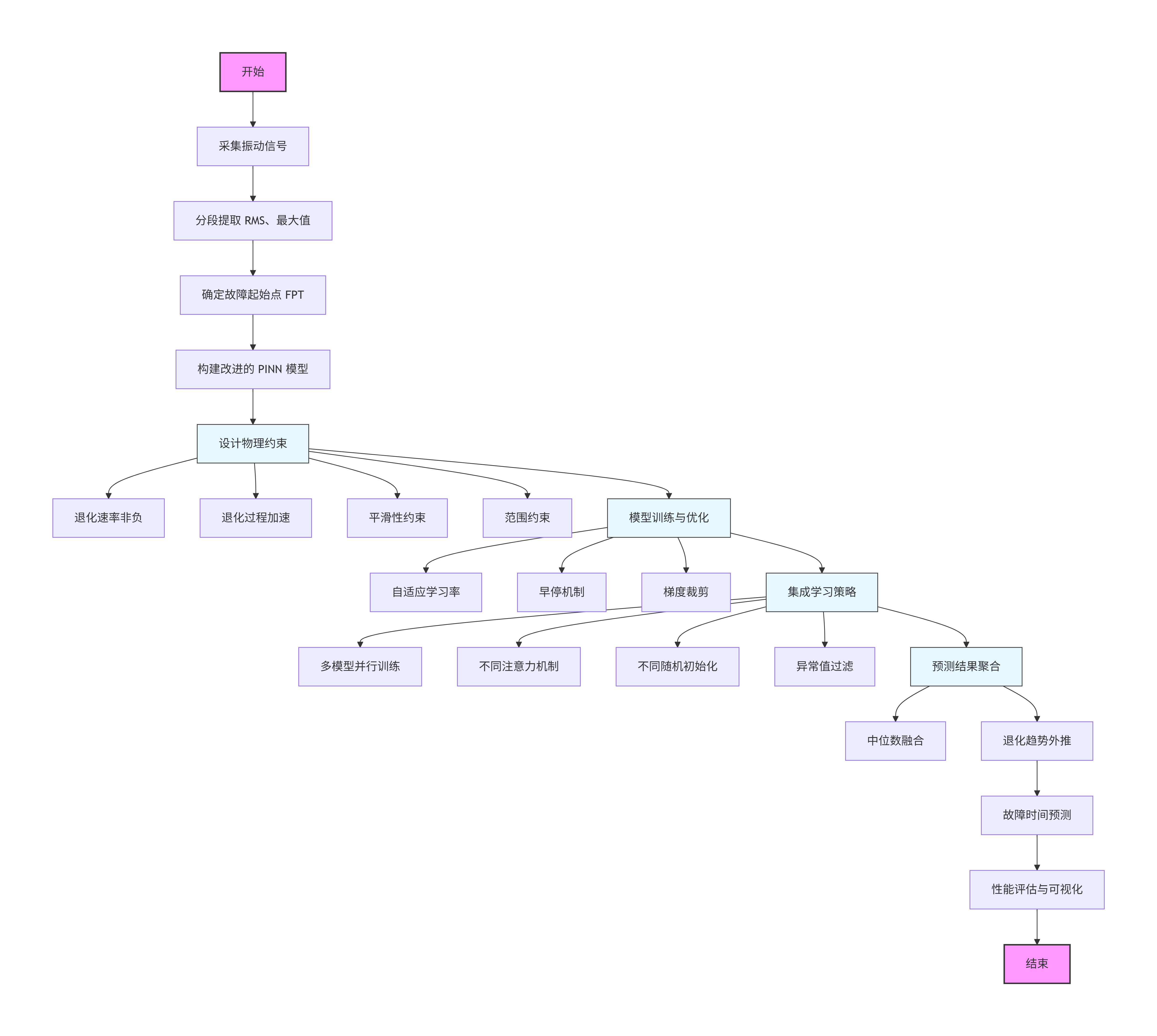 但是,光看数据还不够,因为机器的退化是有规律的,比如一旦开始坏,坏的速度会越来越快,不可能越坏越慢。这种规律就是物理知识。传统的纯数据驱动模型可能会学出违反常识的结果,比如预测退化速率忽快忽慢。所以,想了个办法,把物理规律塞进神经网络里,强迫模型按物理常识来预测,这就是物理信息神经网络(PINN)。同时,为了让预测更稳、更准,训练了好几个不同脑回路(不同结构和初始化)的模型,把它们的结果汇总起来,少数服从多数,这就是集成学习。