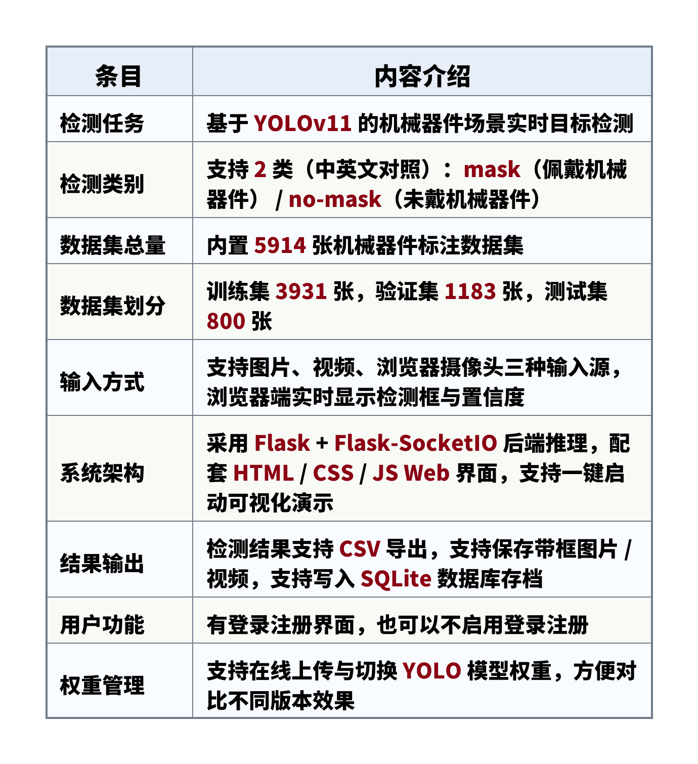 检测类别:支持 2 类(中英文对照):mask(佩戴机械器件) / no-mask(未戴机械器件)