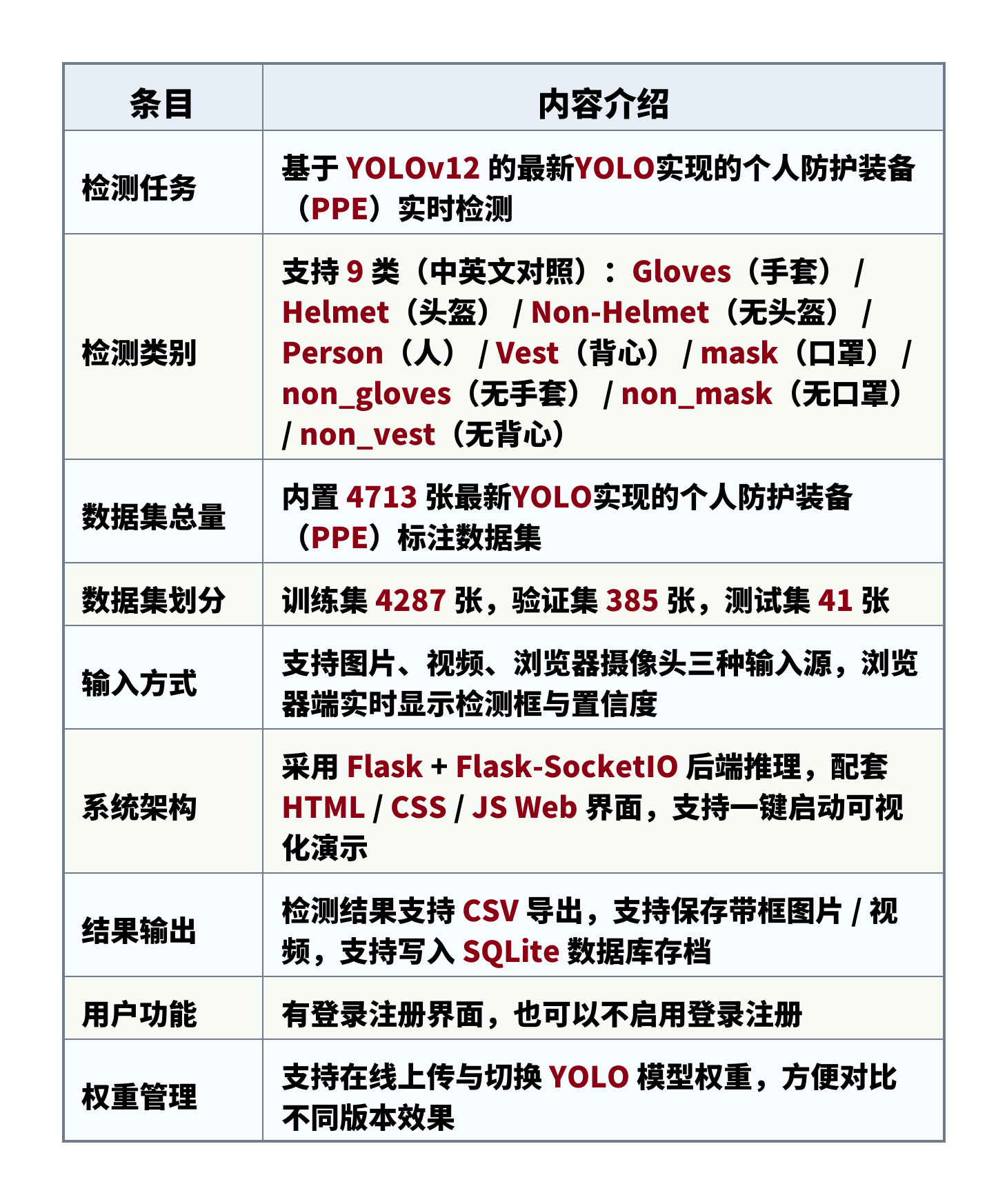 - 数据集总量:内置 4713 张最新YOLO实现的个人防护装备(PPE)标注数据集