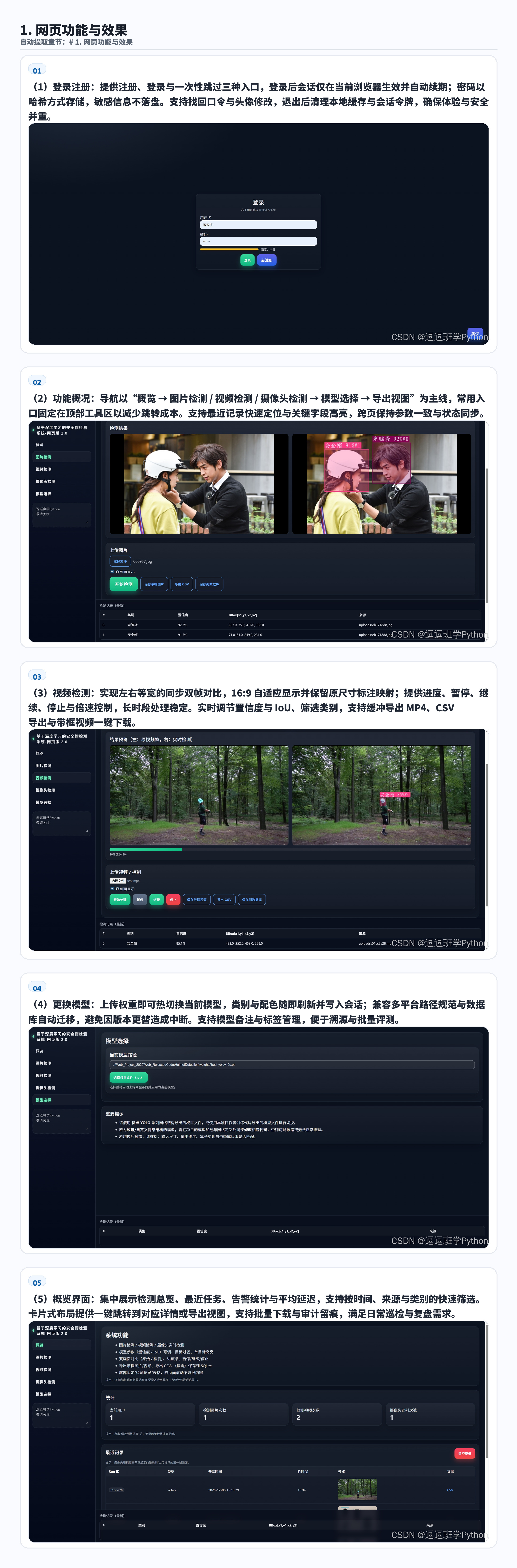 - 输入方式:支持图片、视频、浏览器摄像头三种输入源,浏览器端实时显示检测框与置信度