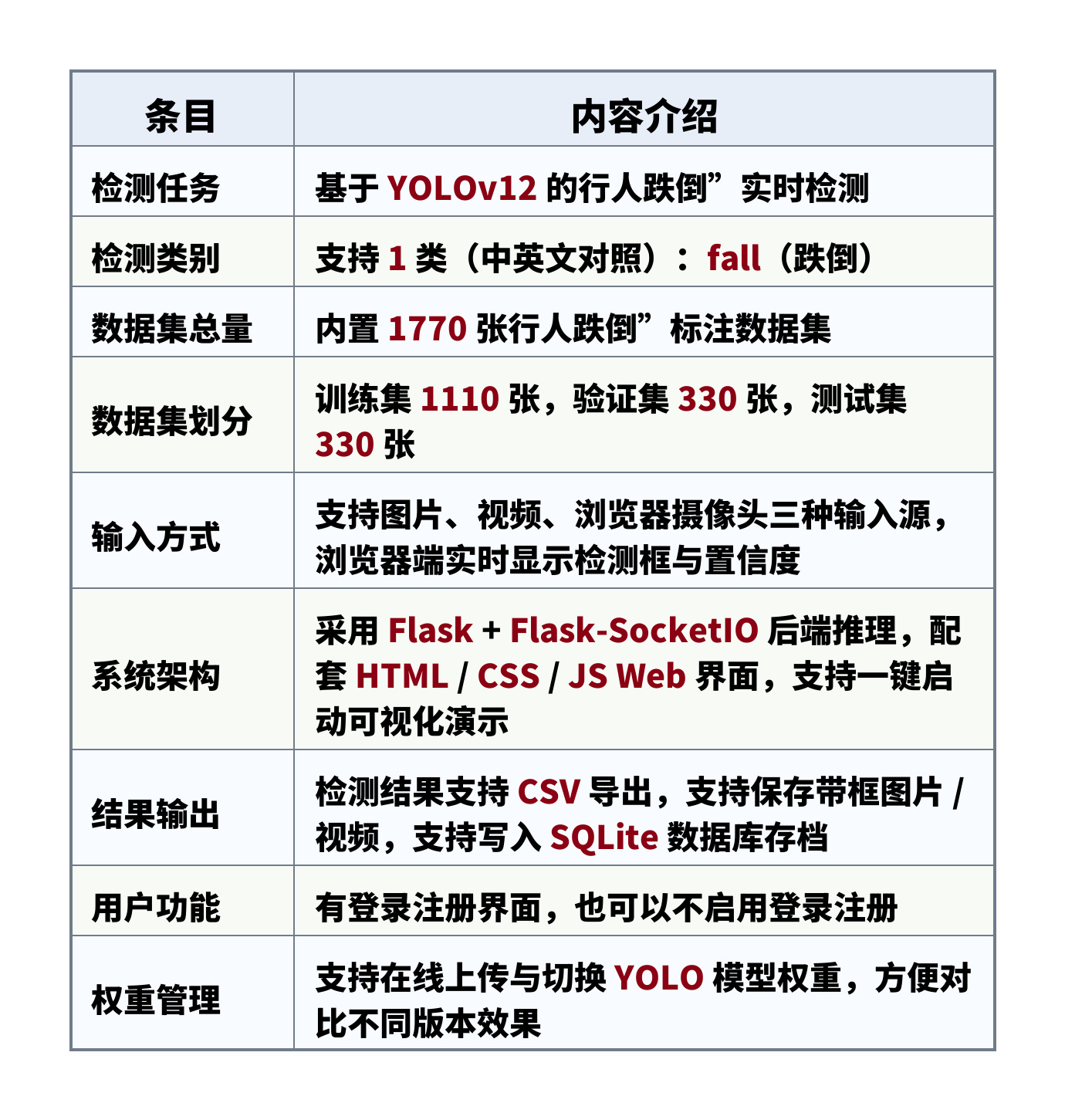 - 数据集总量:内置 1770 张行人跌倒”标注数据集