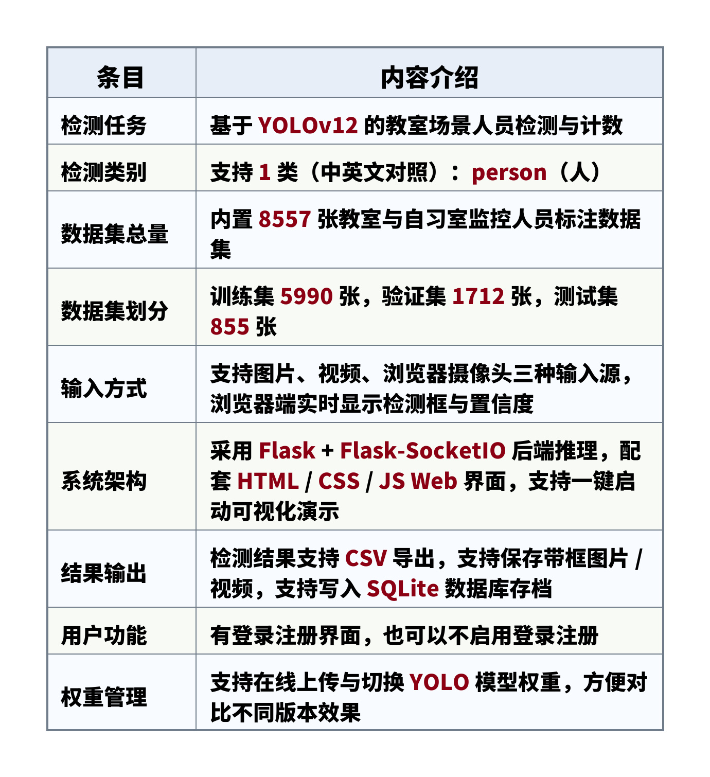 - 数据集总量:内置 8557 张教室与自习室监控人员标注数据集