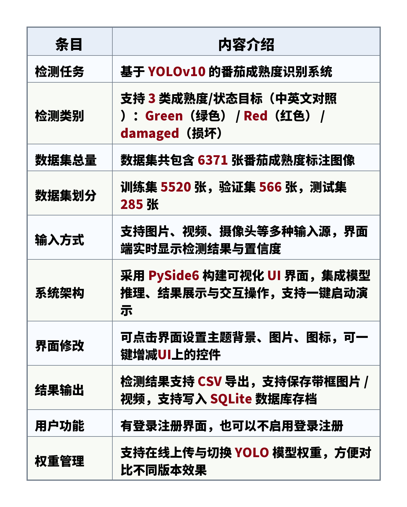 检测类别:支持 3 类成熟度/状态目标(中英文对照):Green(绿色) / Red(红色) / damaged(损坏)