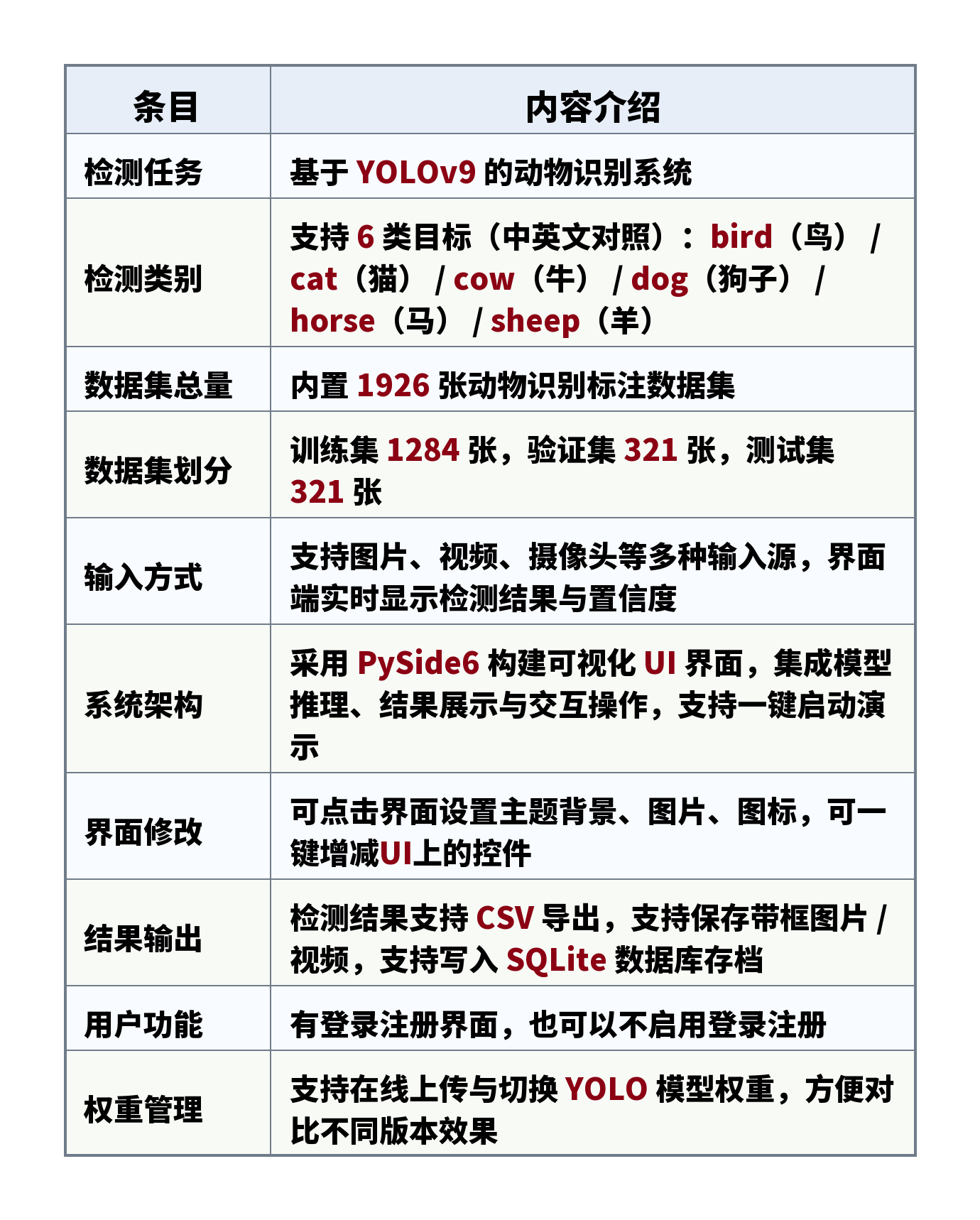 检测类别:支持 6 类目标(中英文对照):bird(鸟) / cat(猫) / cow(牛) / dog(狗子) / horse(马) / sheep(羊)