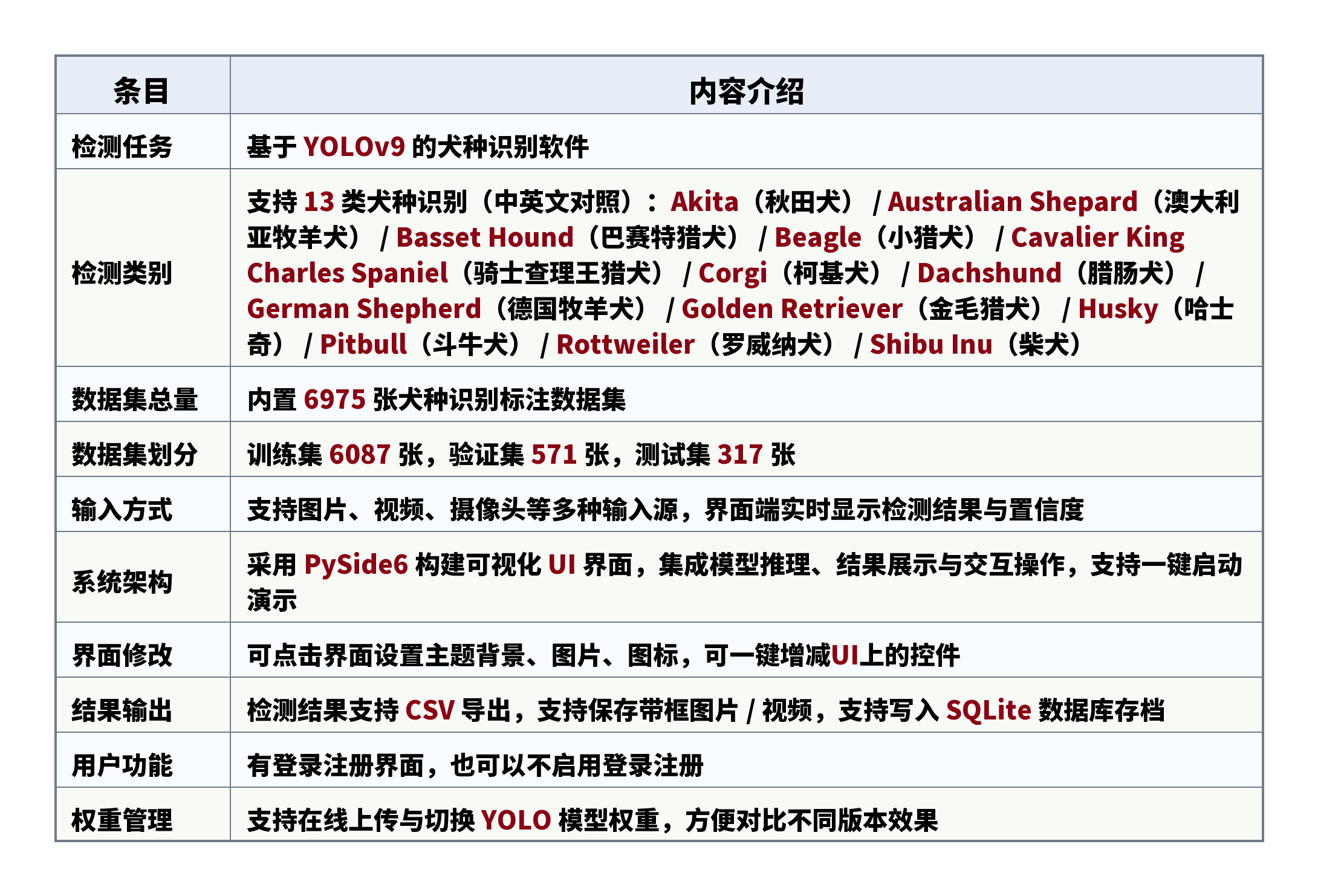 检测类别:支持 13 类犬种识别(中英文对照):Akita(秋田犬) / Australian Shepard(澳大利亚牧羊犬) / Basset Hound(巴赛特猎犬) / Beagle(小猎犬) / Cavalier King Charles Spaniel(骑士查理王猎犬) / Corgi(柯基犬) / Dachshund(腊肠犬) / German Shepherd(德国牧羊犬) / Golden Retriever(金毛猎犬) / Husky(哈士奇) / Pitbull(斗牛犬) / Rottweiler(罗威纳犬) / Shibu Inu(柴犬)