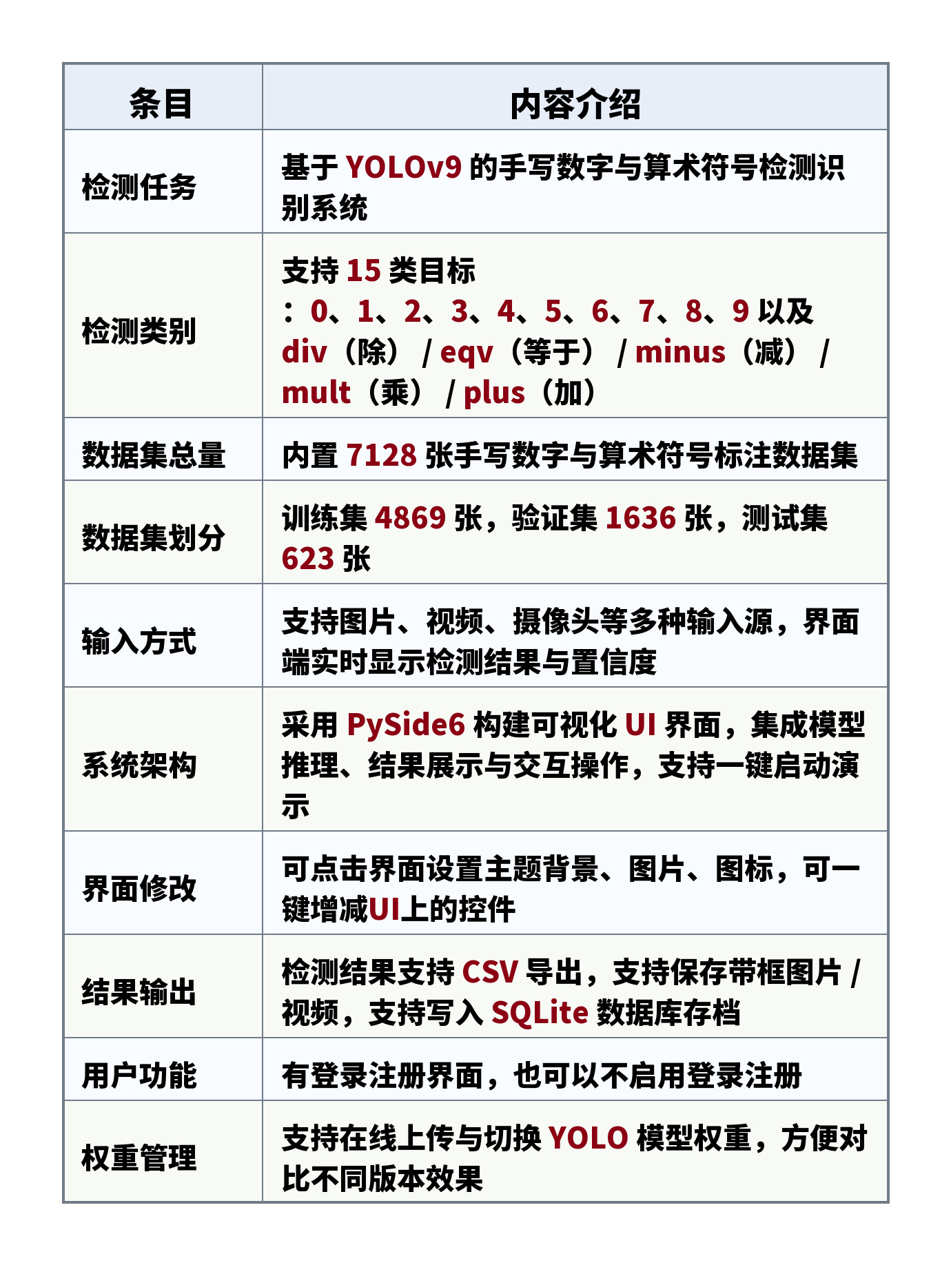 检测类别:支持 15 类目标:0、1、2、3、4、5、6、7、8、9 以及 div(除) / eqv(等于) / minus(减) / mult(乘) / plus(加)
