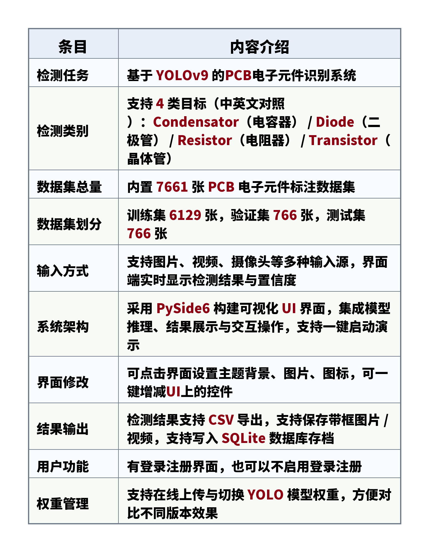 检测类别:支持 4 类目标(中英文对照):Condensator(电容器) / Diode(二极管) / Resistor(电阻器) / Transistor(晶体管)