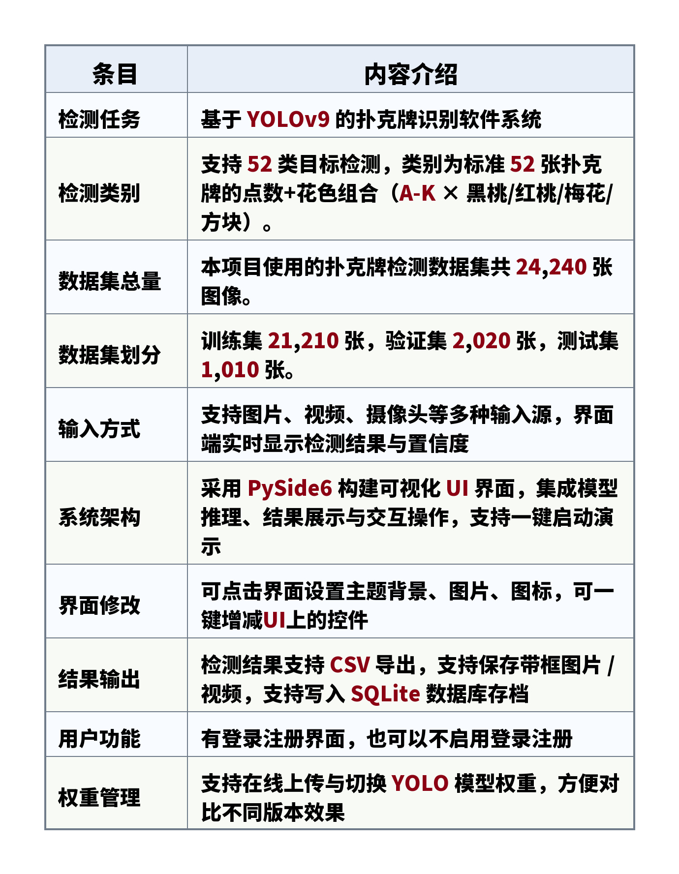 检测类别:支持 52 类目标检测,类别为标准 52 张扑克牌的点数+花色组合(A-K × 黑桃/红桃/梅花/方块)。