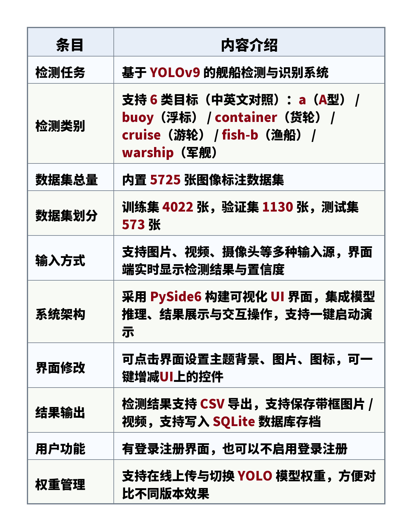 检测类别:支持 6 类目标(中英文对照):a(A型) / buoy(浮标) / container(货轮) / cruise(游轮) / fish-b(渔船) / warship(军舰)