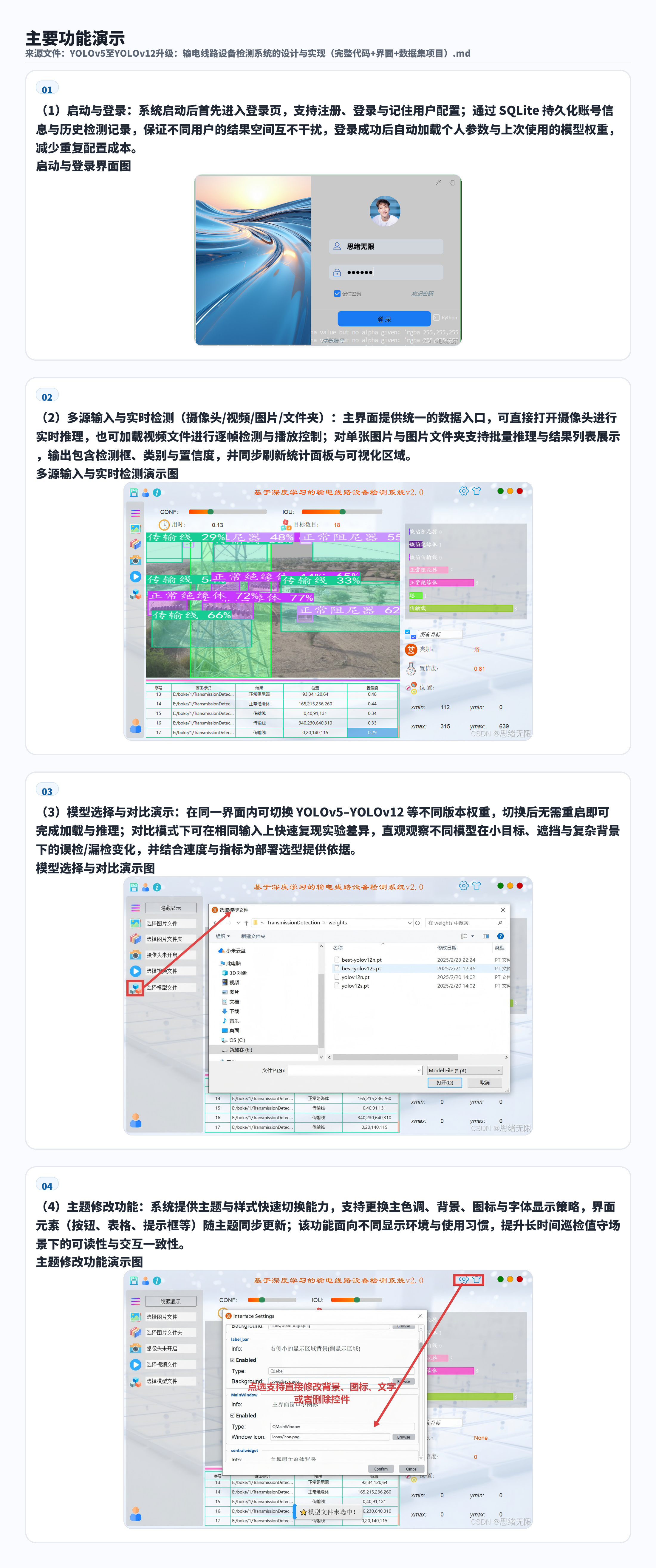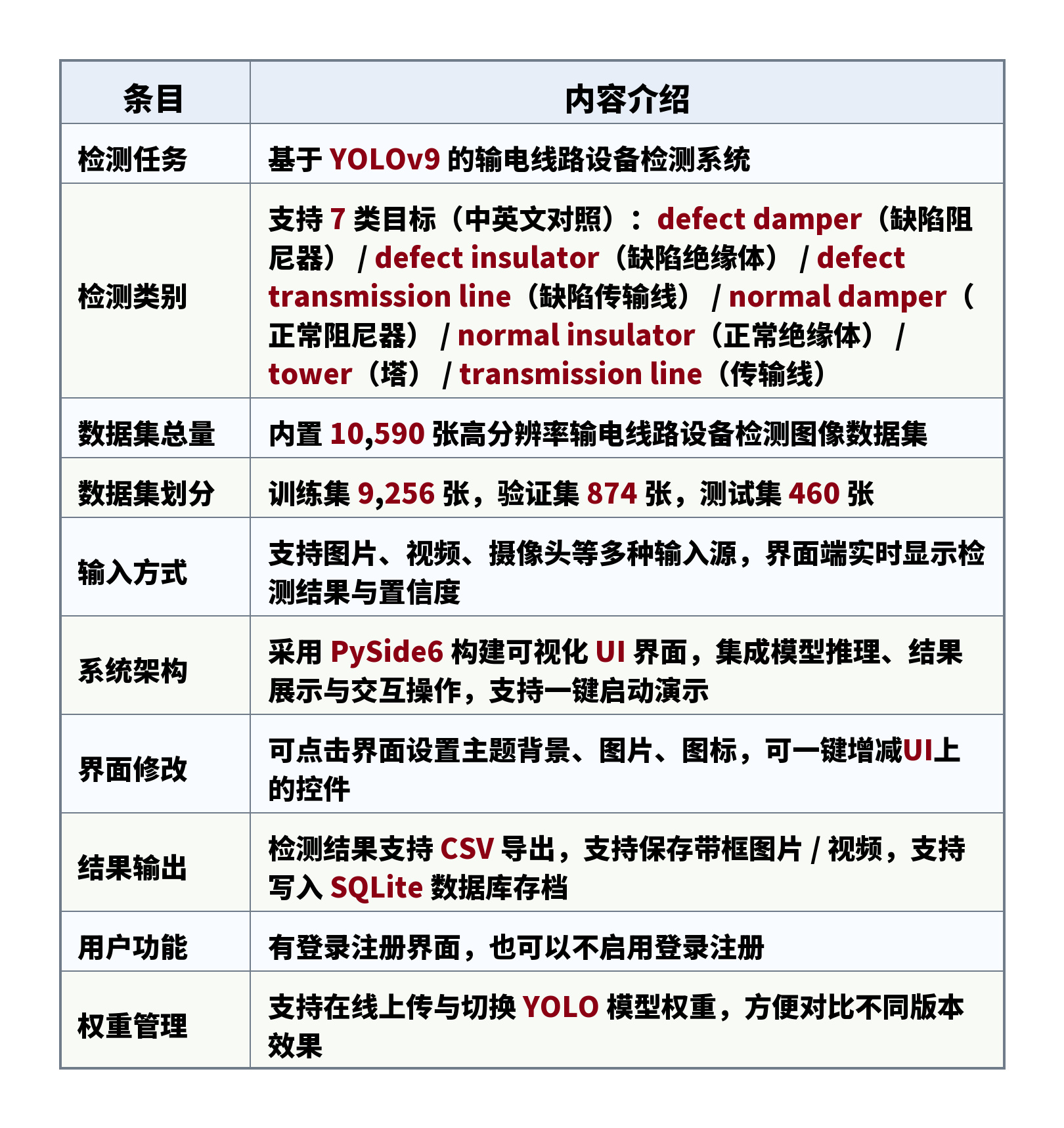 检测类别:支持 7 类目标(中英文对照):defect damper(缺陷阻尼器) / defect insulator(缺陷绝缘体) / defect transmission line(缺陷传输线) / normal damper(正常阻尼器) / normal insulator(正常绝缘体) / tower(塔) / transmission line(传输线)