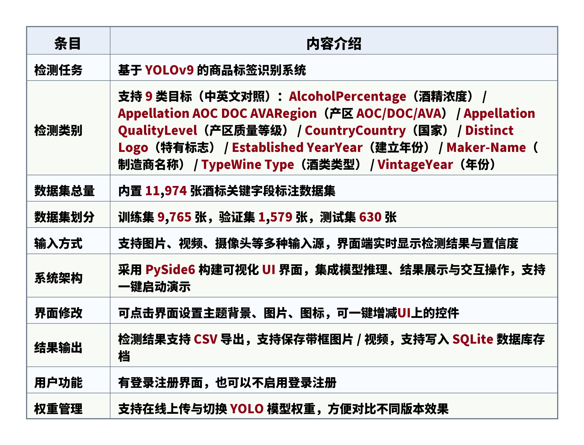 检测类别:支持 9 类目标(中英文对照):AlcoholPercentage(酒精浓度) / Appellation AOC DOC AVARegion(产区 AOC/DOC/AVA) / Appellation QualityLevel(产区质量等级) / CountryCountry(国家) / Distinct Logo(特有标志) / Established YearYear(建立年份) / Maker-Name(制造商名称) / TypeWine Type(酒类类型) / VintageYear(年份)