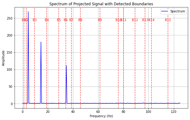 频谱分析找边界 对合并信号做傅里叶变换,看它的频率成分。在频谱上找到那些“山峰”(局部极大值),按山峰的高度从高到低选出前N个(比如15个),用这些山峰的位置作为频带的分割点。