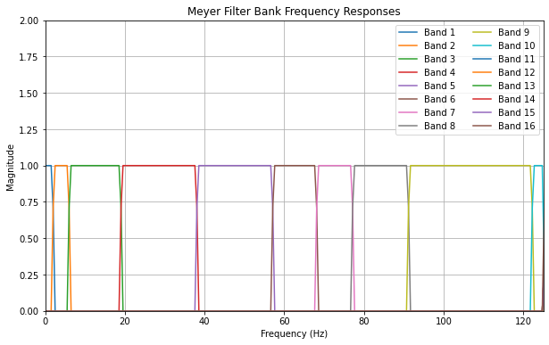 设计滤波器组 根据这些分割点,设计出一组Meyer小波滤波器,每个滤波器负责一个频段,并且相邻滤波器之间是平滑过渡的,保证重构时无失真。