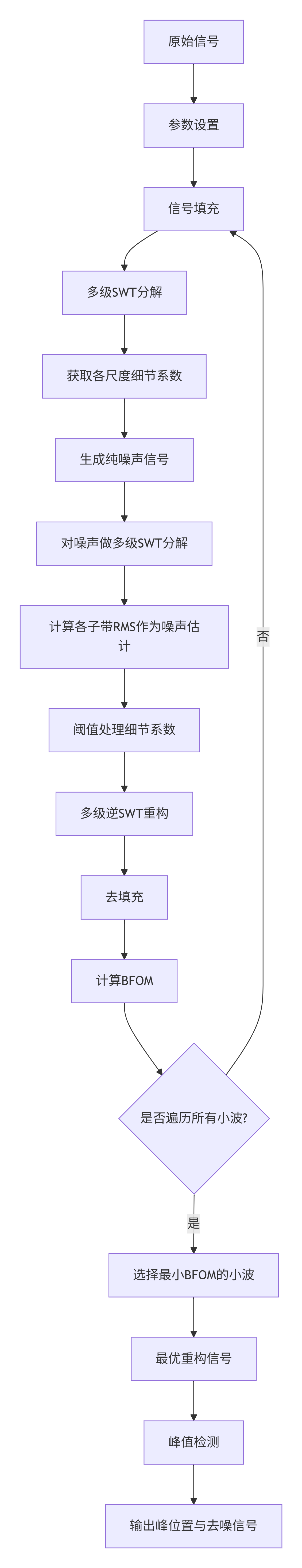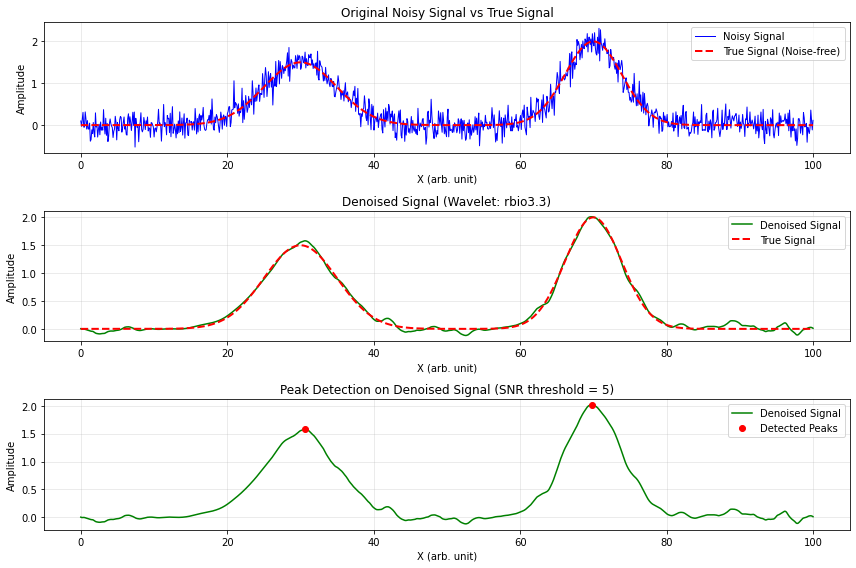 这个算法在去掉噪声的同时保留重要的特征(比如光谱峰)。它先通过平稳小波变换把信号分解成不同粗细的“层”,然后专门用纯噪声信号去估计每一层里的噪声有多大,接着把每一层里比噪声小的系数剪掉(阈值处理),再把这些层重新拼回干净的信号。为了找到最合适的小波(就像选最合适的刷子),算法会用3个质量指标自动比较不同小波的结果,选出最优的。最后,在干净信号上用峰值检测功能,就能准确找到信号的“亮点”(比如光谱线)。