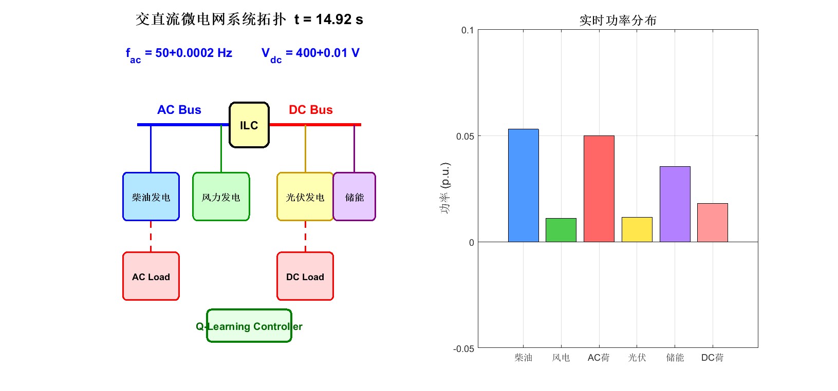 传统的负荷频率控制(Load Frequency Control, LFC)方法主要包括PID控制、模型预测控制等,这些方法高度依赖精确的系统数学模型。然而,交直流微电网具有多源异构、拓扑多变、参数时变等特征,建立精确模型十分困难。同时,传统方法对随机性源荷扰动的自适应能力不足,控制效果难以达到预期。针对上述问题,本文提出基于Q学习(Q-Learning)的交直流微电网负荷频率控制方法。Q学习是一种无模型(Model-Free)的强化学习算法,智能体通过与环境交互获取经验,逐步学习最优控制策略,无需预先建立精确的系统模型,且能够自适应地应对源荷扰动,具有显著的工程应用价值。