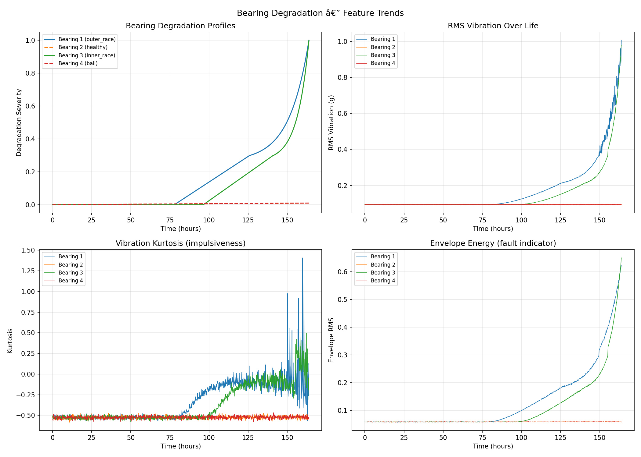 一、依据轴承几何参数与转频计算典型故障特征频率,并基于物理退化模型生成四组轴承从健康到失效的全寿命周期振动信号。