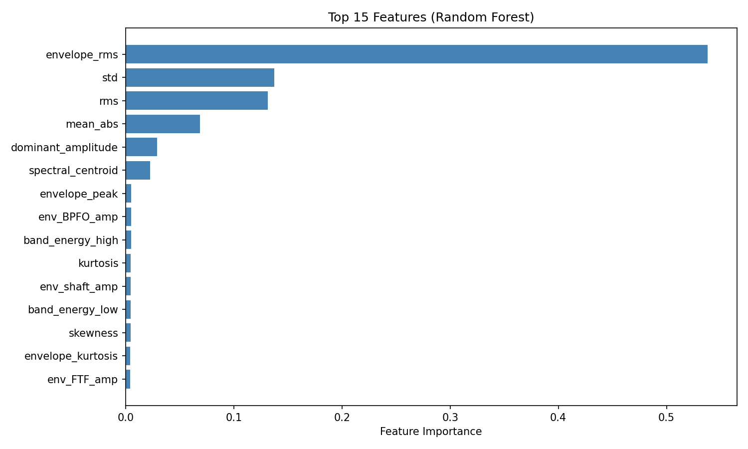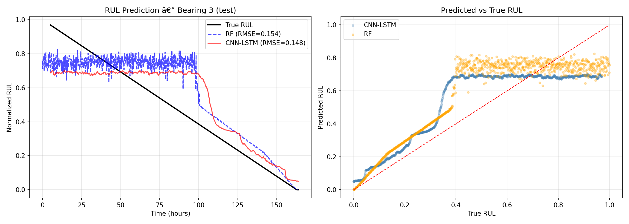 滚动轴承作为旋转机械的核心部件,剩余使用寿命预测对保障设备安全运行与实现预测性维护至关重要。传统方法依赖人工提取振动信号的时频域统计特征,虽具有一定可解释性但泛化能力有限,而深度学习方法虽能自动学习时序模式却常忽略底层物理机理。本算法构建了一套融合物理机理与深度学习的混合框架,通过生成符合轴承故障频率与退化规律的合成振动数据,提取包含时域、频域及包络分析的27维物理特征,分别采用随机森林与CNN-LSTM时序模型进行剩余寿命预测,既保持了模型的可解释性,又利用深度网络捕捉退化过程的长期依赖关系,在合成数据集上验证了物理特征对模型性能的基础性支撑作用。