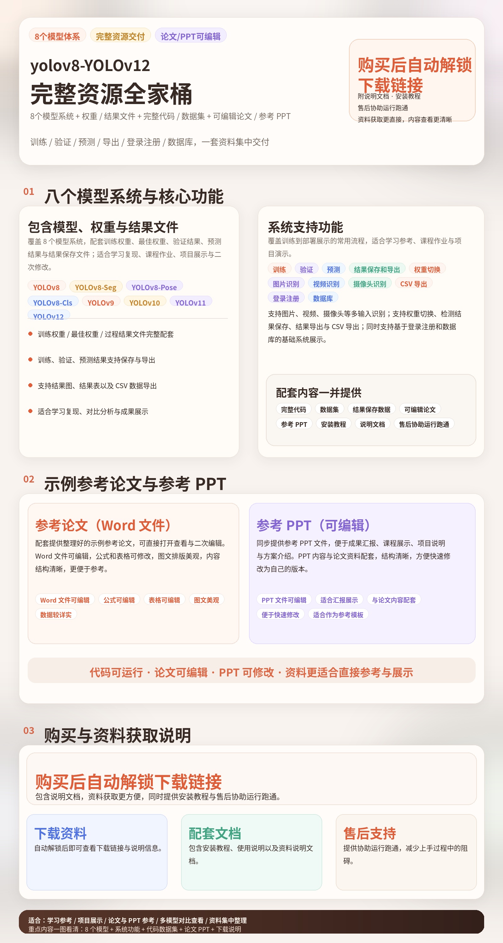 【全家桶概览】该资源围绕 夜间车辆检测系统 提供 YOLOv5 至 YOLOv12 共八个模型版本的系统代码,并附论文 Word、PPT 和运行说明,便于从项目开发到论文整理的一体化参考。