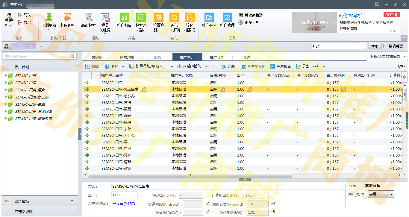 默认url:广告上线前替换成你的推广url,切记替换 口臭百度推广账户备份文件详情如下: 1、关键词数量:1070个 2、创意数量:258条 3、计划数量:7个 4、单元数量:86个 5、计划层级否定关键词数量:176个 6、计划层级精确否定关键词数量:200个 7、单元层级否定关键词数量:0个 8、单元层级精确否定关键词数量:157个 请有需要的客户付费下载使用,我们只提供已经做好的物料备份文件,暂不提供其他服务。 特别提醒:付款后不退不换
