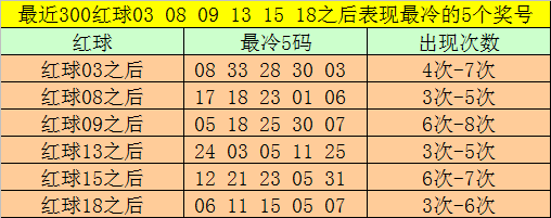 红球冷码统计:双色球第2021016期开出红球奖号分别为:03、08、09、13、15、18,在最近300期开奖中,各号码出现之后其下期出现最少的5个红球分别为: