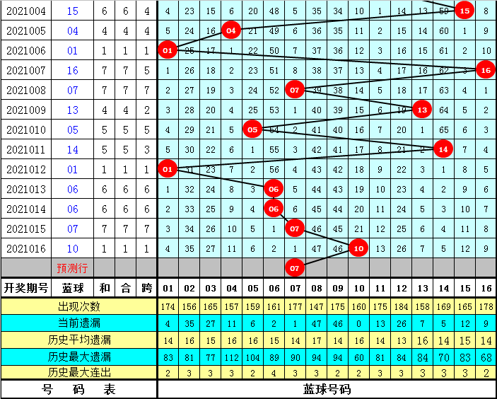 上期开出蓝球号码10,该号码在最近300期中出现了20次,其下期分别开出:蓝球04出现4次,蓝球01、16出现3次,蓝球02、08出现2次,蓝球05、06、07、12、15出现1次,蓝球03、09、10、11、13、14出现0次。本期五码蓝球参考07、11、12、13、16,独蓝关注07。