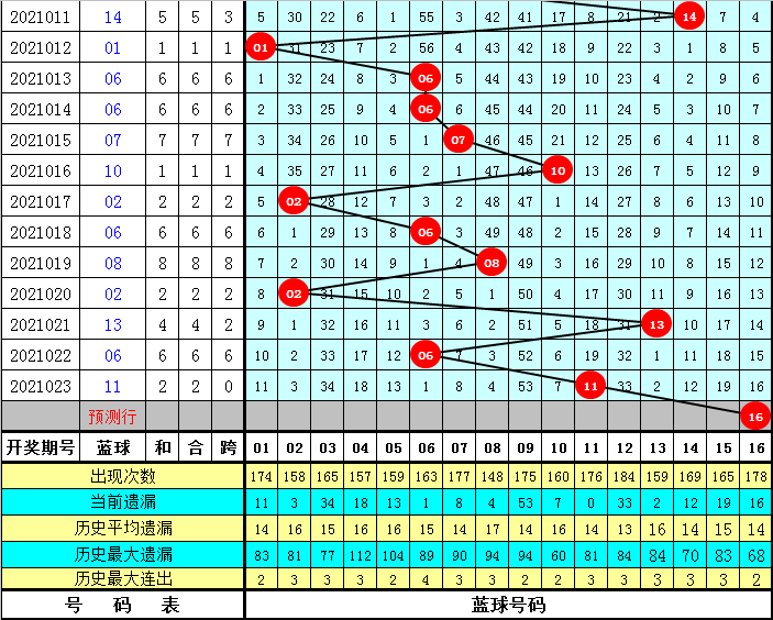 蓝球分析:上期开出蓝球号码11为2路蓝球,最近10期蓝球号码012路比为3:3:4,最近5期蓝球号码012路比为1:1:3,本期排除0路蓝球,关注蓝球号码16。
