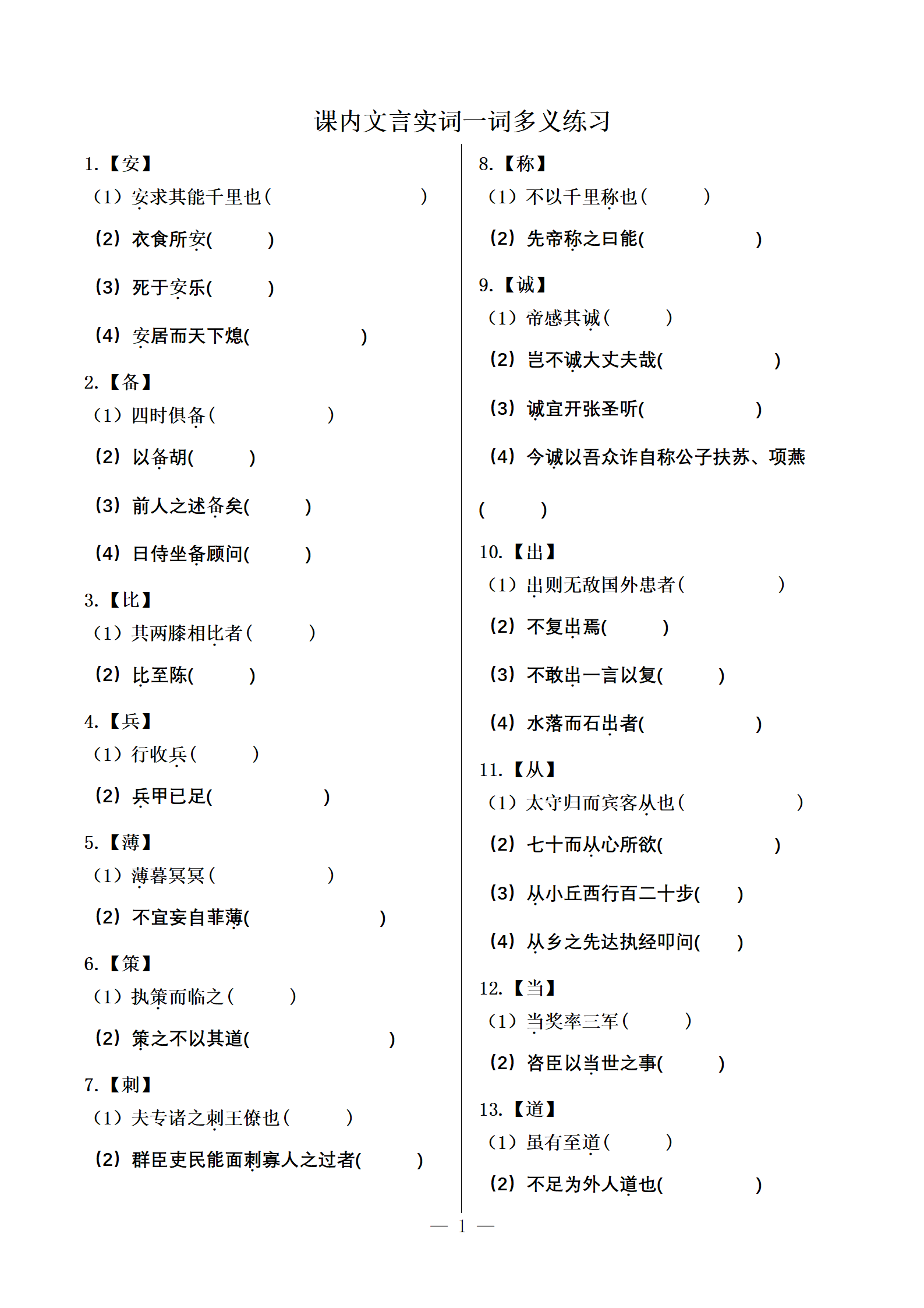 初中语文课本常见实词虚词一词多义练习,有答案,word版,适合中考复习使用,可以反复打印练习。