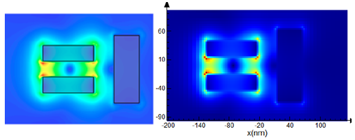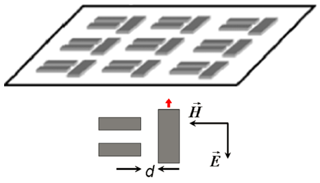 如上图所示,超表面的基本单元由三个 Ag 纳米棒组成。右侧纳米棒的长宽分别为 128 nm 和 50 nm;左侧两个纳米棒的长宽分别为 100 nm 和 30 nm;左侧两个纳米棒的间距为 30 nm;纳米棒的厚度均为 20 nm;图中 d = 40~100 nm。图中的红色箭头是电场探针。
