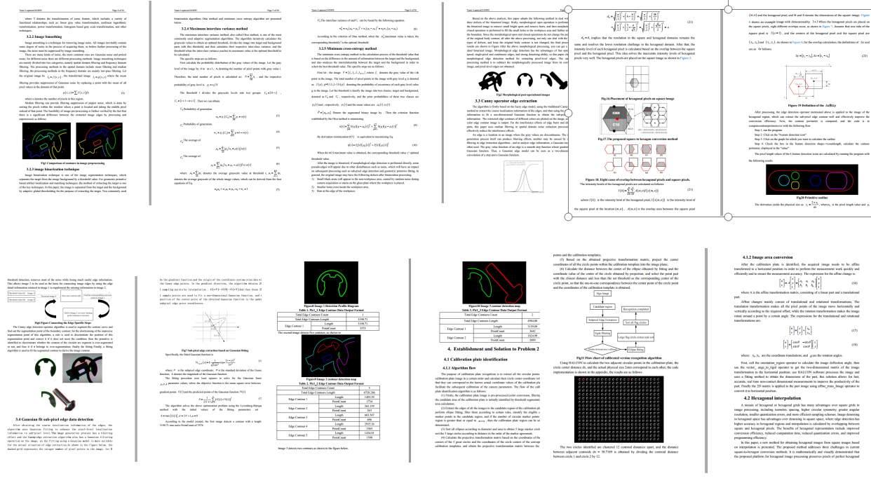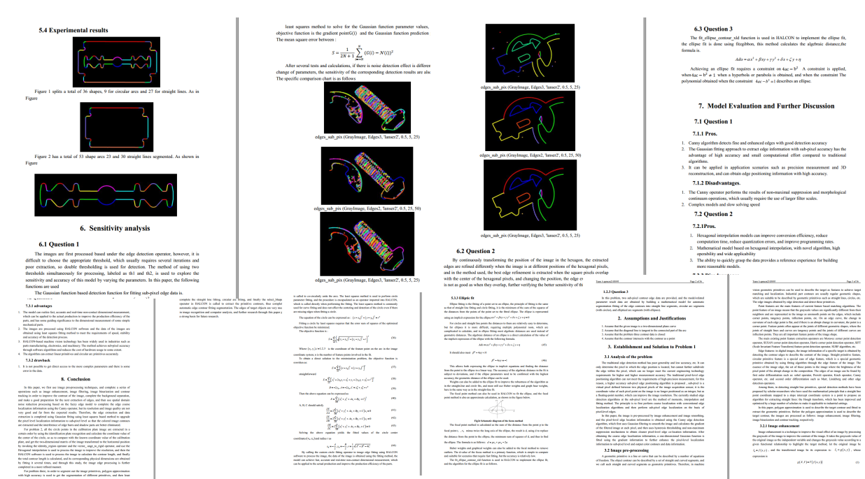 针对问题1,由于图像边缘定位的精度会受到毛刺和阴影的影响,本文首先使用Canny边缘检测算法获取像素级边缘定位信息,然后使用高斯滤波对图像进行平滑处理,计算滤波后图像在每个像素点的梯度,然后使用滞后阈值和非最大抑制机制获得更清晰的像素级粗边缘定位信息。最后,利用一维高斯函数拟合梯度信息,将像素级定位信息进一步增强到亚像素级,并输出颜色轮廓和数据信息。