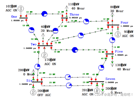 搭建一个基于PowerWorldd的复杂模型,如图所示,同时也表征着其正常运行状态下的潮流分布情况。