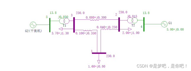 如图2-1所示,该系统由两台发电机、两台变压器、三条交流输电线路以及三个负荷组成的一个具有5节点的环网,其中节点1、2、3均为PQ节点,节点4为PV节点,节点5为平衡节点。图中参数均用标幺值表示,母线1、2、3基准电压为230kV,母线4、5基准电压为13.8kV,基准功率为100MVA。