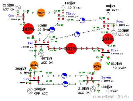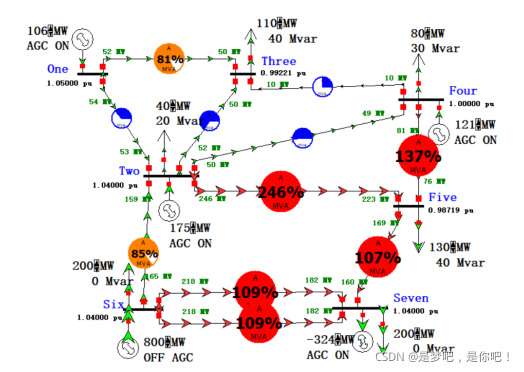 当节点Six上的发电机有功出力增加至800MW时,系统的潮流发生较大改变,如图所示,多条线路处于过负荷运行状态下,电压水平也稍有降低。