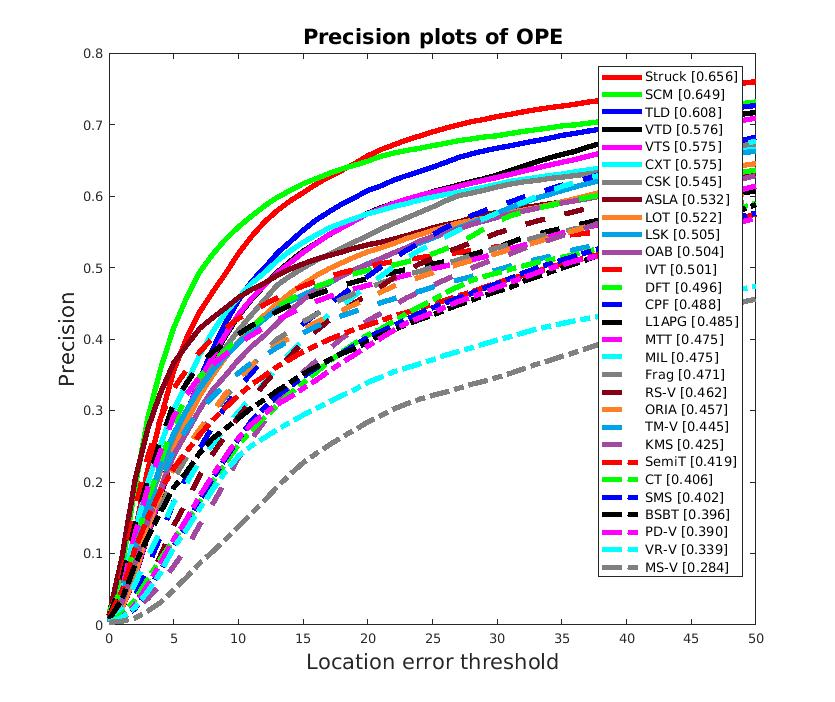 官网给的toolkit代码部分有点小bug,而且gt文件只有51个,不能测试OTB2015或者叫做OTB100。这里放上我整理好直接可以用的供大家下载。官方的代码需要rankingType = 'AUC’时能得到正确的success plot;rankingType = 'threshold’时能得到正确的precision plot,而这里改过以后就不需要运行两次了,运行一次就可以直接出来正确的success plot和precision plot