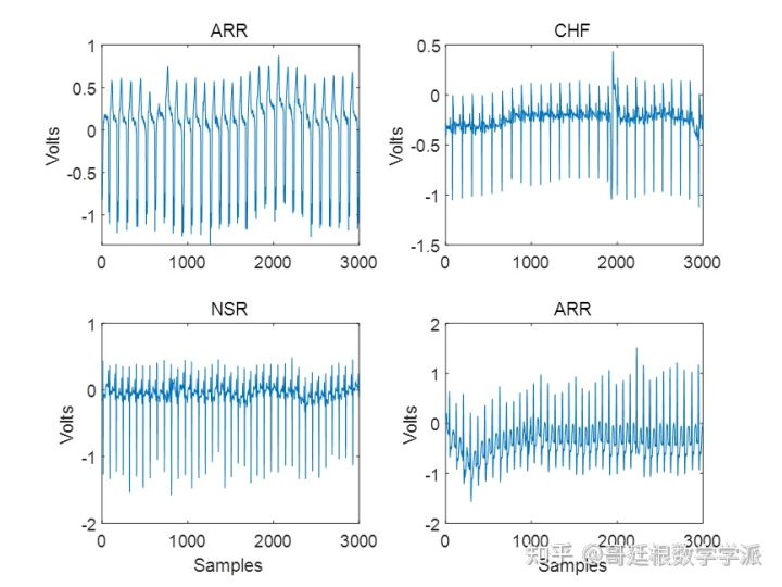 本文使用从3种 ECG 数据:心律失常数据、充血性心力衰竭数据和正常窦性心律数据,共使用来自3个 PhysioNet 数据库的162条ECG 记录:MIT-BIH心律失常数据库、MIT-BIH正常窦性心律数据库和BIDMC充血性心力衰竭数据库。 共有96个心律失常患者的信号,30个充血性心力衰竭患者的信号,以及36个正常窦性心律患者的信号,目标就是训练分类器来区分心律失常 (ARR)、充血性心力衰竭 (CHF)和正常窦性心律 (NSR)3类信号。
